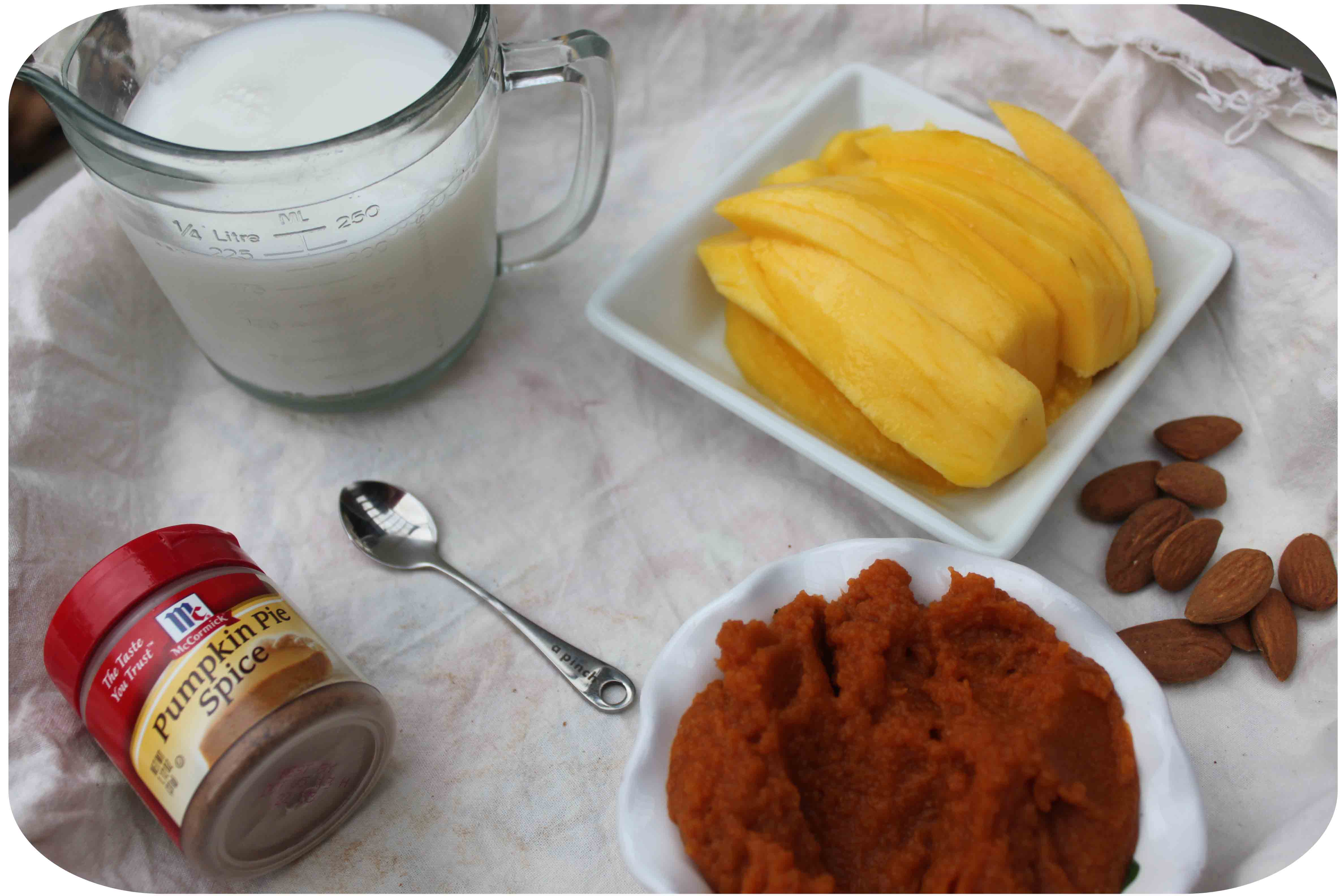 I made a smoothie with 200 ml coconut milk, a fresh mango, 10 almonds, about 1/4 of a can of pumpkin and a pinch of pumpkin pie spice.