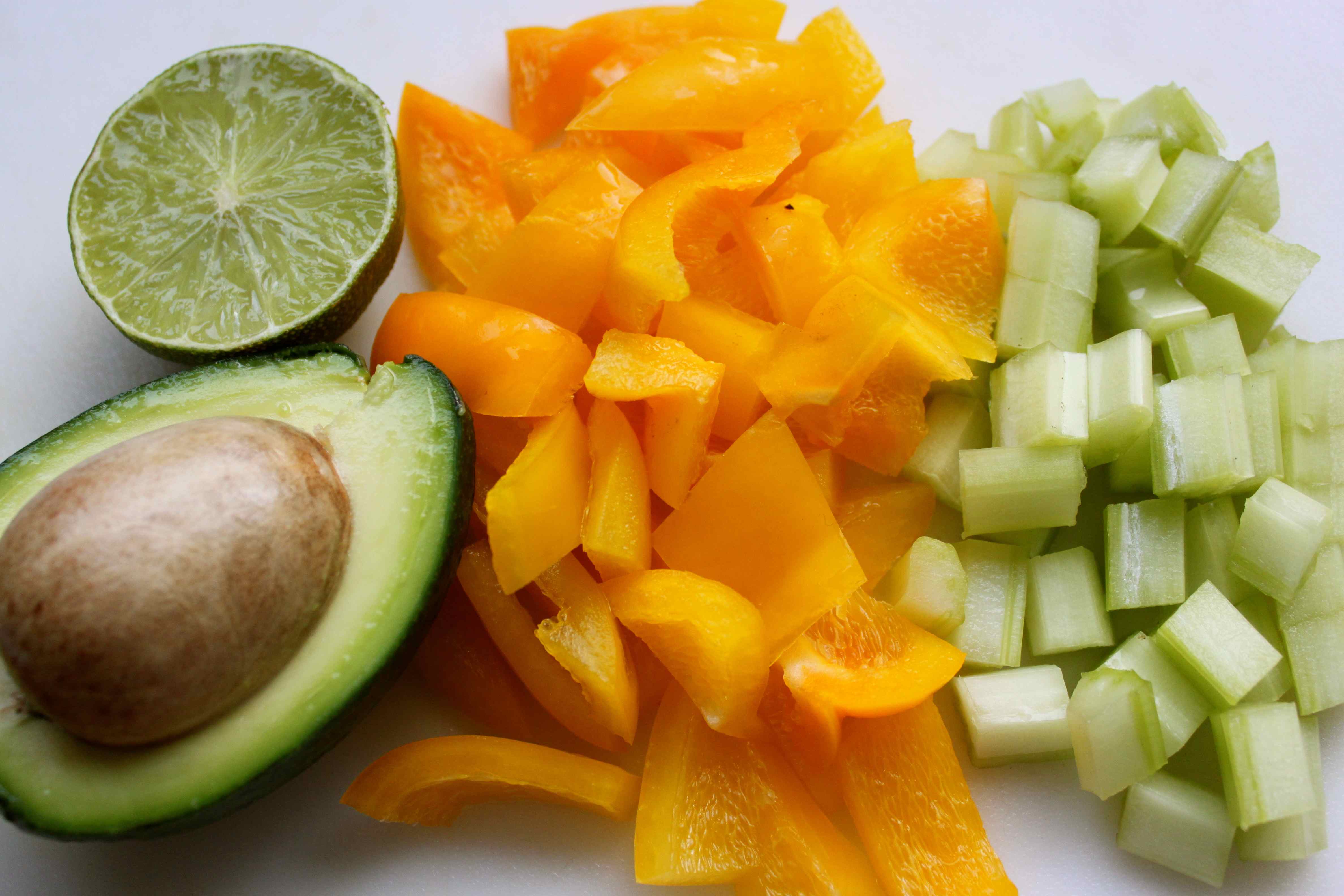 - While the quinoa is cooking, prepare the other vegetables, except the avocado, peel and cut the boiled egg and squeeze the lime juice.