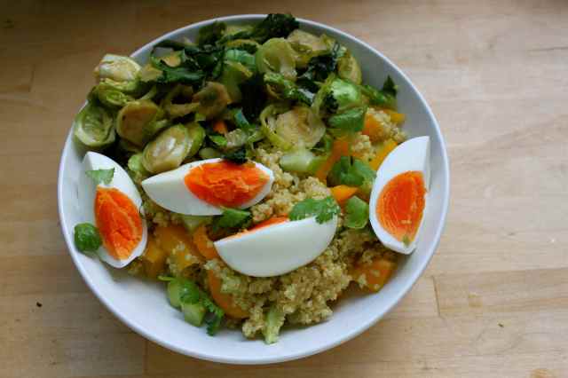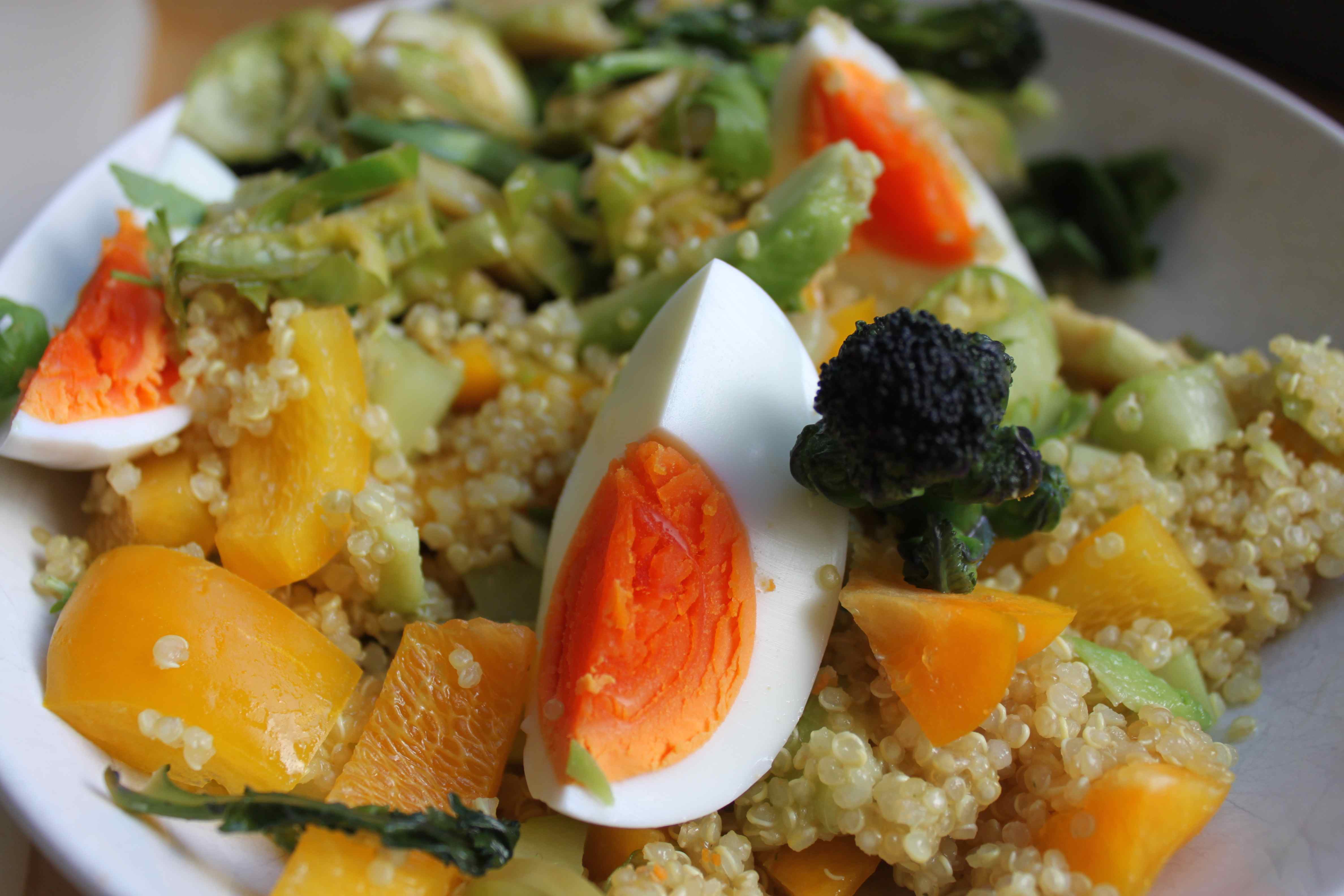 - Serve the quinoa salad and add the coriander, cooked vegetables (optional) and egg.