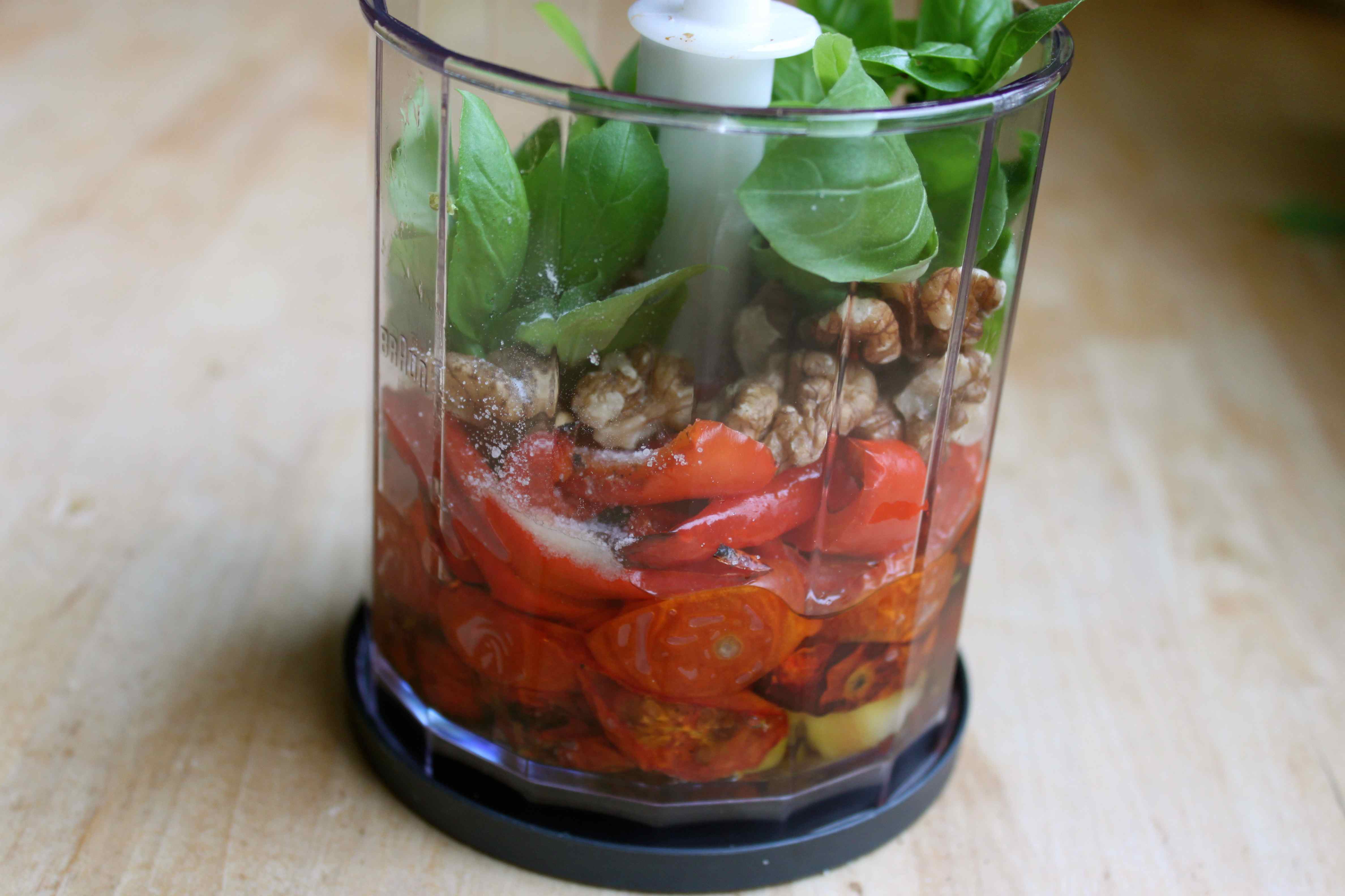 When the vegetables were roasted and cooled, I blitzed them in a small blender with fresh basil, walnuts, olive oil and salt and pepper.
