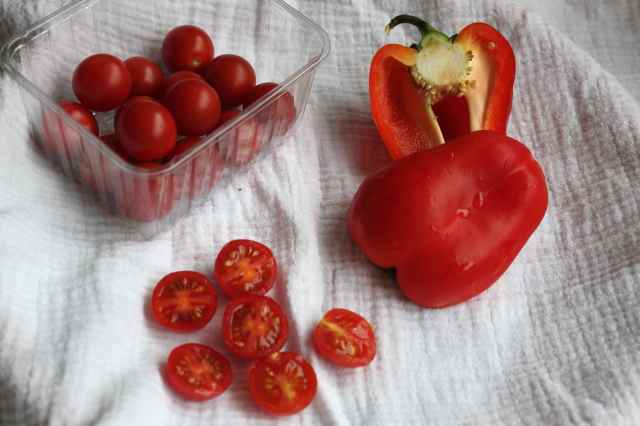 I am feeling uber healthy today and want to have a vegetable based lunch. I have a punnett of tasteless cherry tomatoes. I can’t bring myself to eat them in a salad so I decided to roast them with a red pepper.