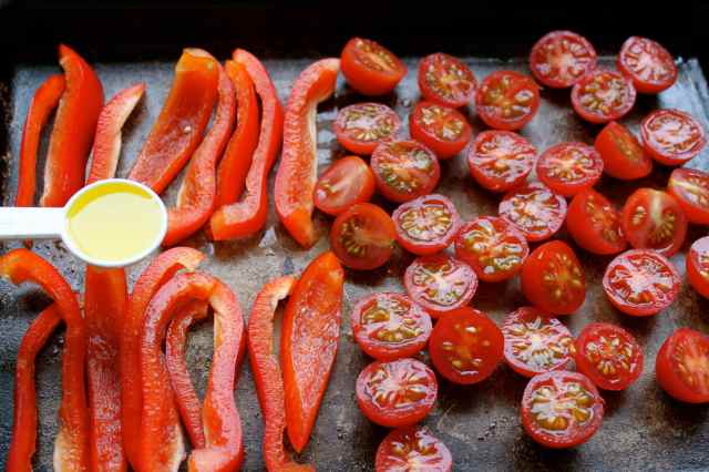 I cut them in half, sliced the red pepper and brushed on 1 tsp of olive oil, then added salt and pepper.