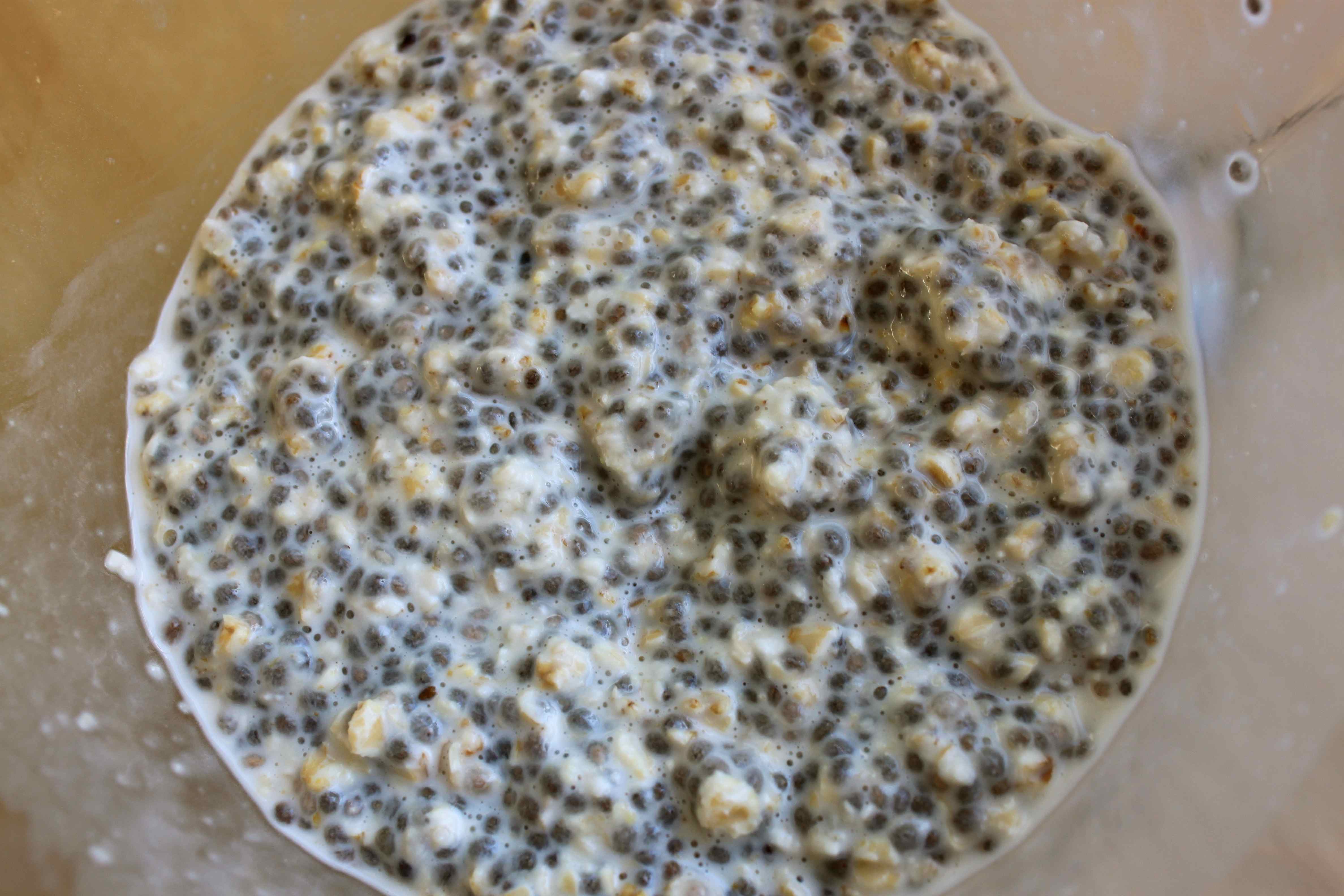 I put 1/3 of a cup of oats in a bowl with 2/3 of a cup of coconut milk, 1 tbsp chia seeds and 1/2 a tsp of vanilla. I didn’t put it in the fridge but left it covered, on the side and today this is what it looked like. The Chia seeds look like poppy seeds but having sat in coconut milk all night, they absorb the liquid and swell up.