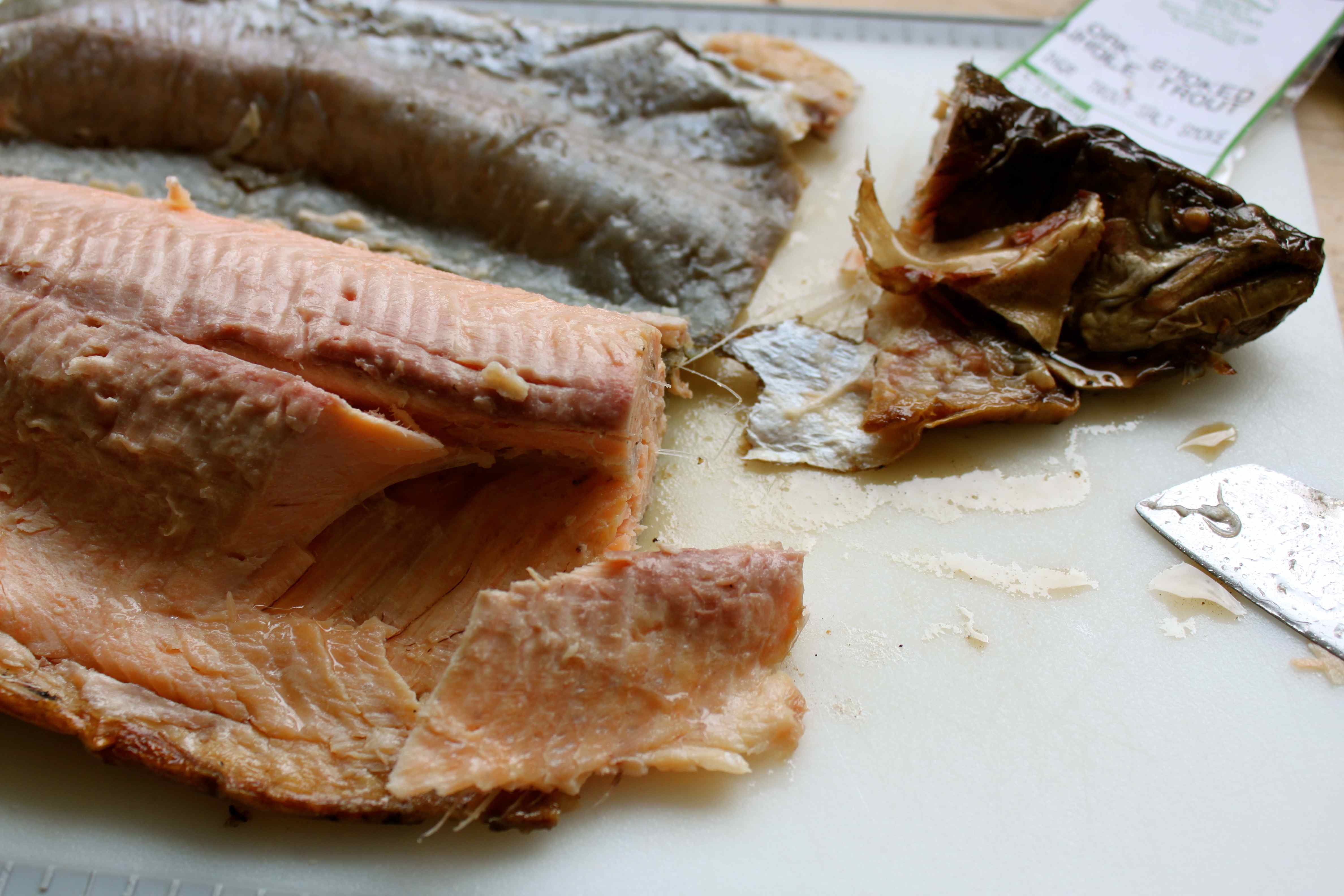- While the potato is cooking, remove the skin and bones from the trout. This is an ugly old fish. Well sorry little fishy, but you are!