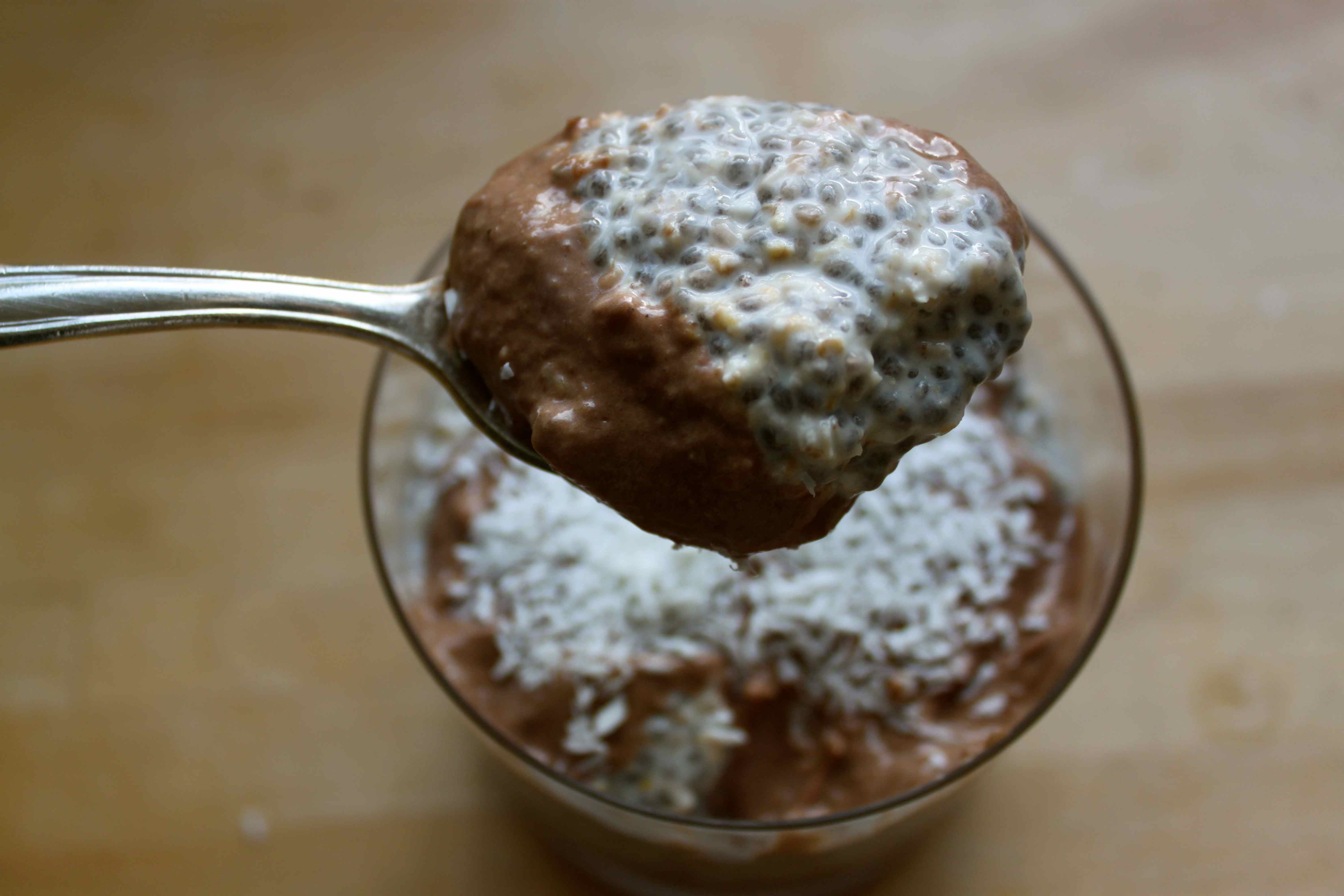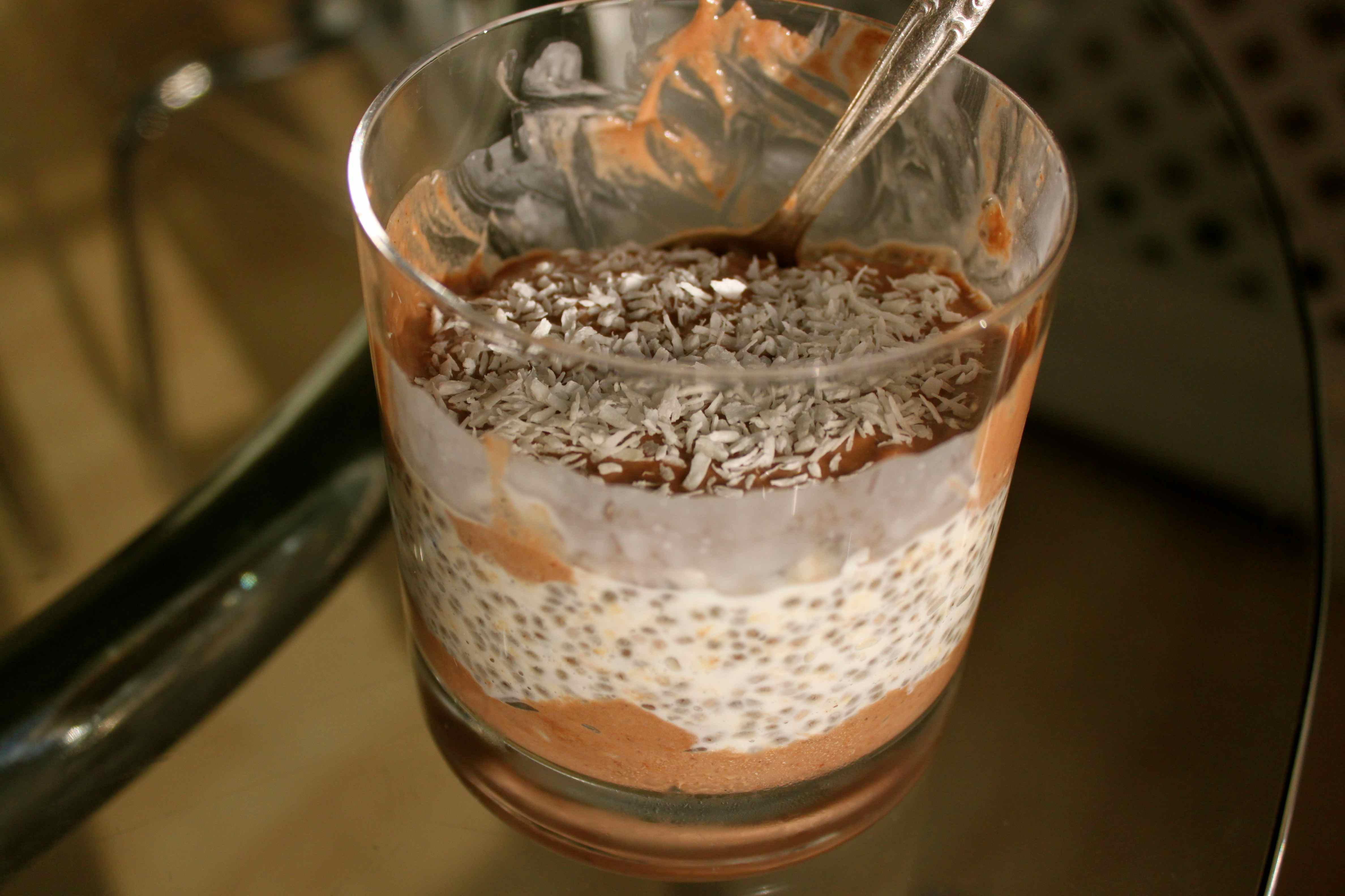 I thought going for multiple layers was a bit ambitious so I just went for 3; chocolate bananas on the bottom, overnight oats and chia seeds in the middle and a bit more chocolate banana on top. I then added 1/2 a tbsp of desiccated coconut. Doesn’t it look pretty?