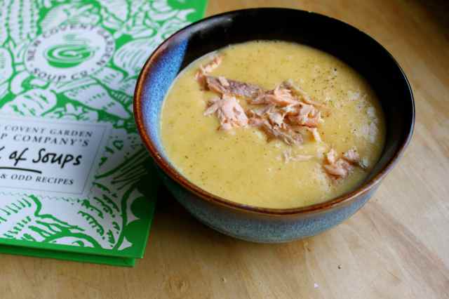 Yes, I happened to have a smoked trout in the fridge – truly! I had been persuaded to try it by Julie of Sussex Smokers at the Farmers Market last week who promised me it would be delicious. I wasn’t sure what to do with it so it had sat in my fridge until today. The fish was lovely on its own and as a soup it was good. The consistency was thick and smooth and not too fishy or cheesy. I was going to add 2 tbsp creme fraiche but when I went to use it, it had gone off – well, it had sat in the fridge for nearly 2 weeks since I opened it! This would have made it creamier and richer which would have been good but is not necessary. I would say this is a successful soup.