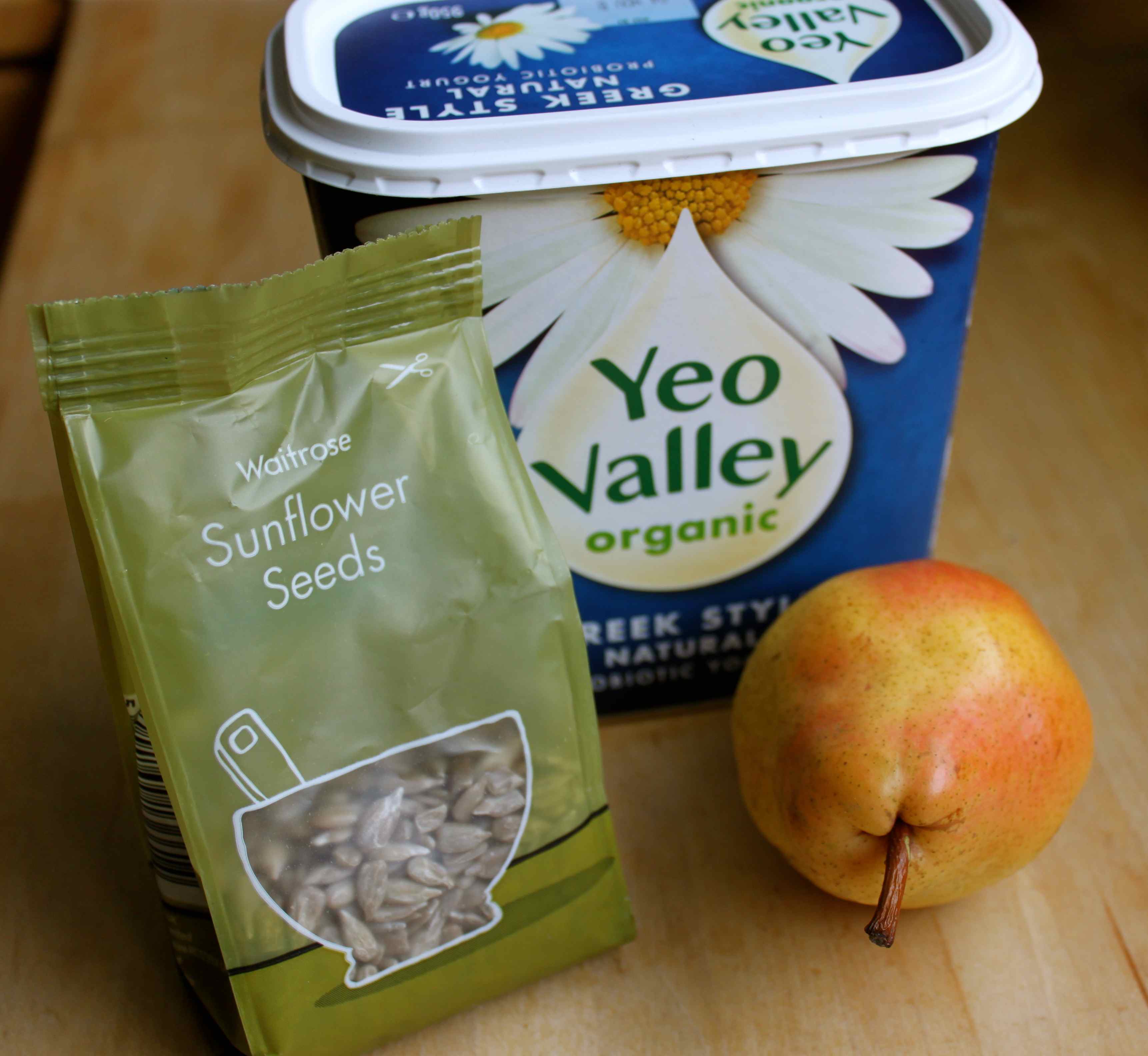 Saturday mornings always seem so busy in our house and I was popping in and out constantly. It was one of those mornings when I would be in for 15 minutes before dashing off again, which is not long enough to do anything useful, such as eat breakfast. Eventually, at 11:30 am I made a very simple breakfast with 60 g yogurt, 6 g sunflower seeds and one pear.