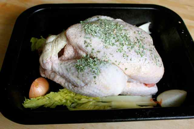 I like my chicken to be cooked with tarragon and lemon. I think the aniseed in tarragon goes beautifully with chicken. I put the chicken in to a roasting tray and rub olive oil on to the outside of the chicken, then squeeze half a lemon over it and put the squeezed half in the breast cavity. I then add tarragon (ideally fresh but dried will do), salt and pepper to the outside of the chicken. I poured about 130 ml of white wine in to the roasting tray, some celery and an onion which I had quartered. This creates a small amount of richly flavoured stock, which I use as the base for the gravy.