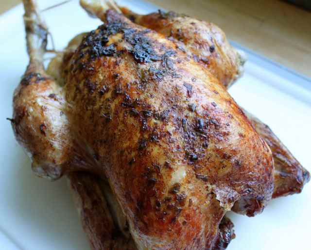 I put the chicken in the oven at 220 ° C for half an hour and then turn the oven down to 170 ° C for about 1 and a half hours, but it could be more or less, depending on how big the chicken is. When it is cooked, I put it on the carving board, cover it with foil to keep warm and let it rest for about 10 – 15 minutes so I can finish off the meal and make gravy.