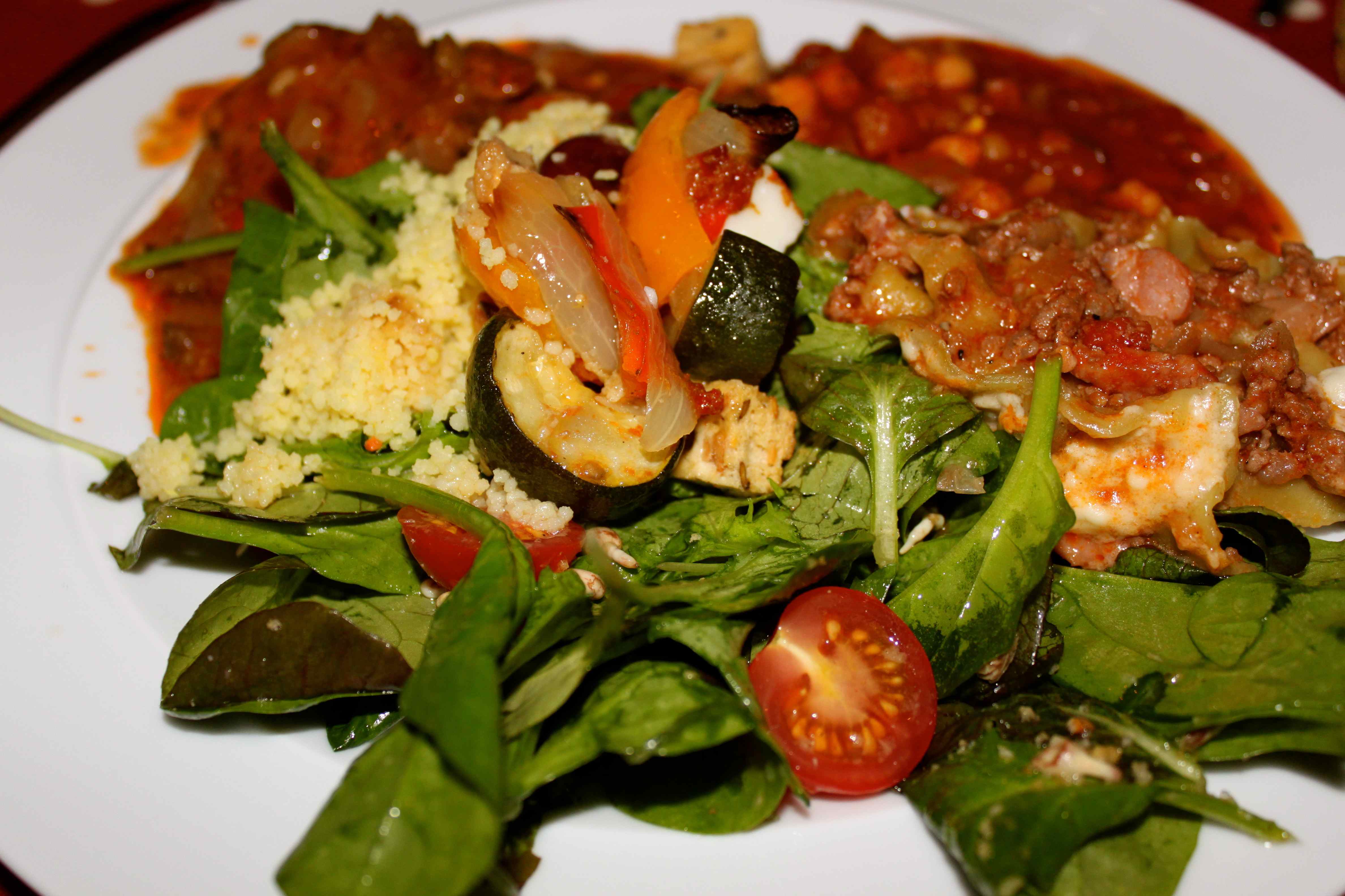 which was followed by North African squash and chick pea casserole, chicken cooked with a rich tomato sauce and prunes ( I will get this recipe and post it later for you), couscous with roasted vegetables, lasagne and a green salad.