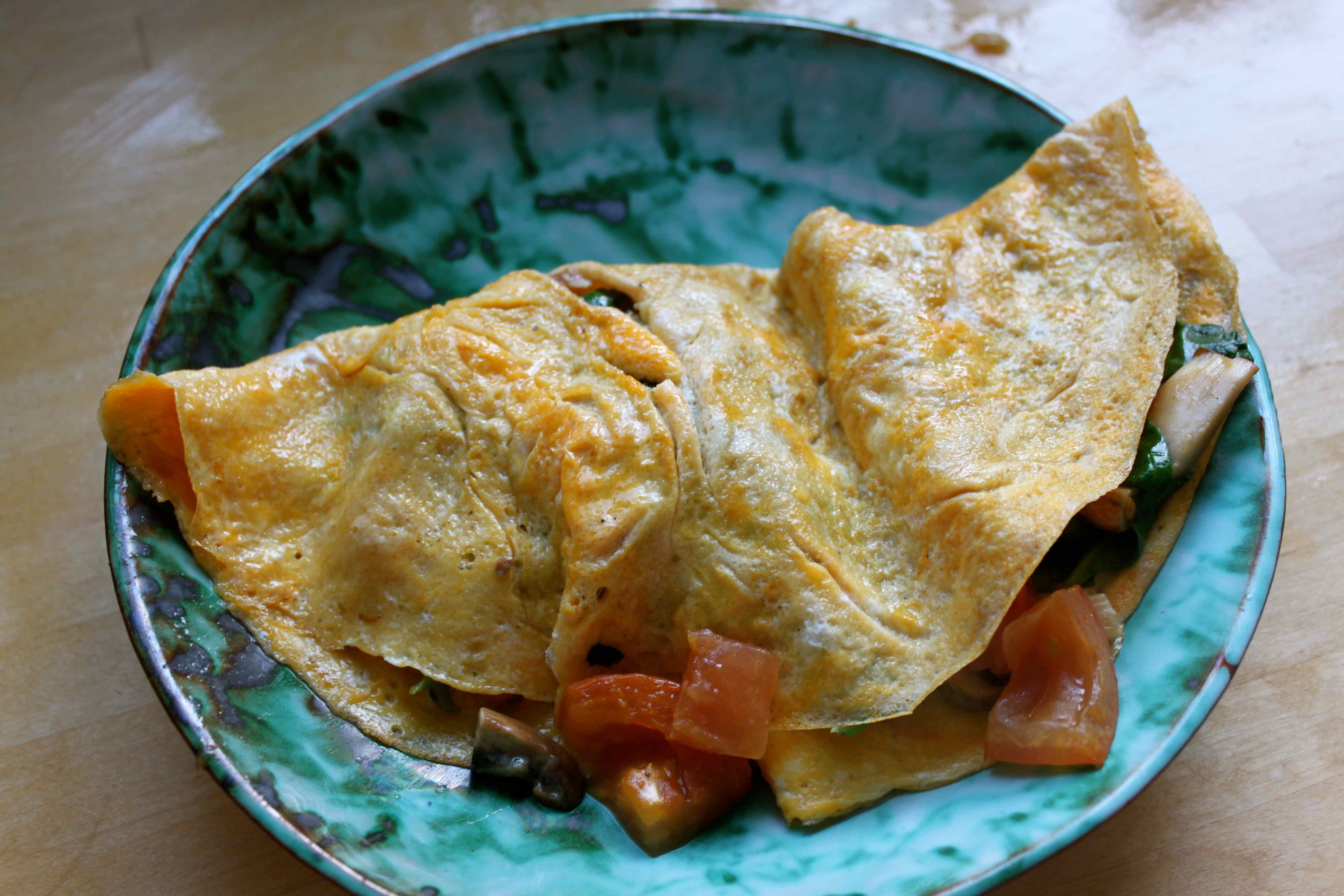 fried the veg and then set them aside while I fried the egg in butter. When the egg was nearly set I put the veg on one half of the omelette to finish off the cooking.