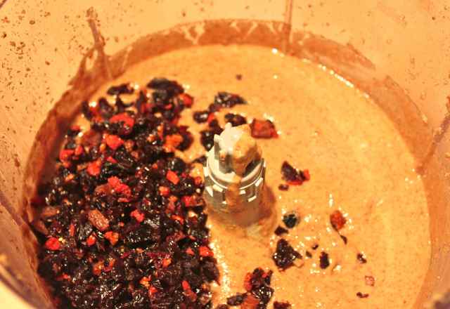 My nut butter stash is somewhat depleted so this afternoon I made some almond butter with mixed dried berries. My inspiration came from The Edible Perspective which is a wonderful food blog which has excellent photos and many recipes I want to try. She makes an almond butter with cherries and chocolate. I added extra mixed berries instead of the chocolate.