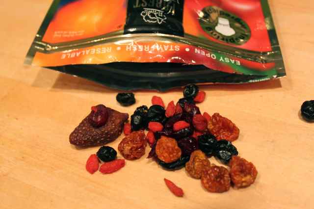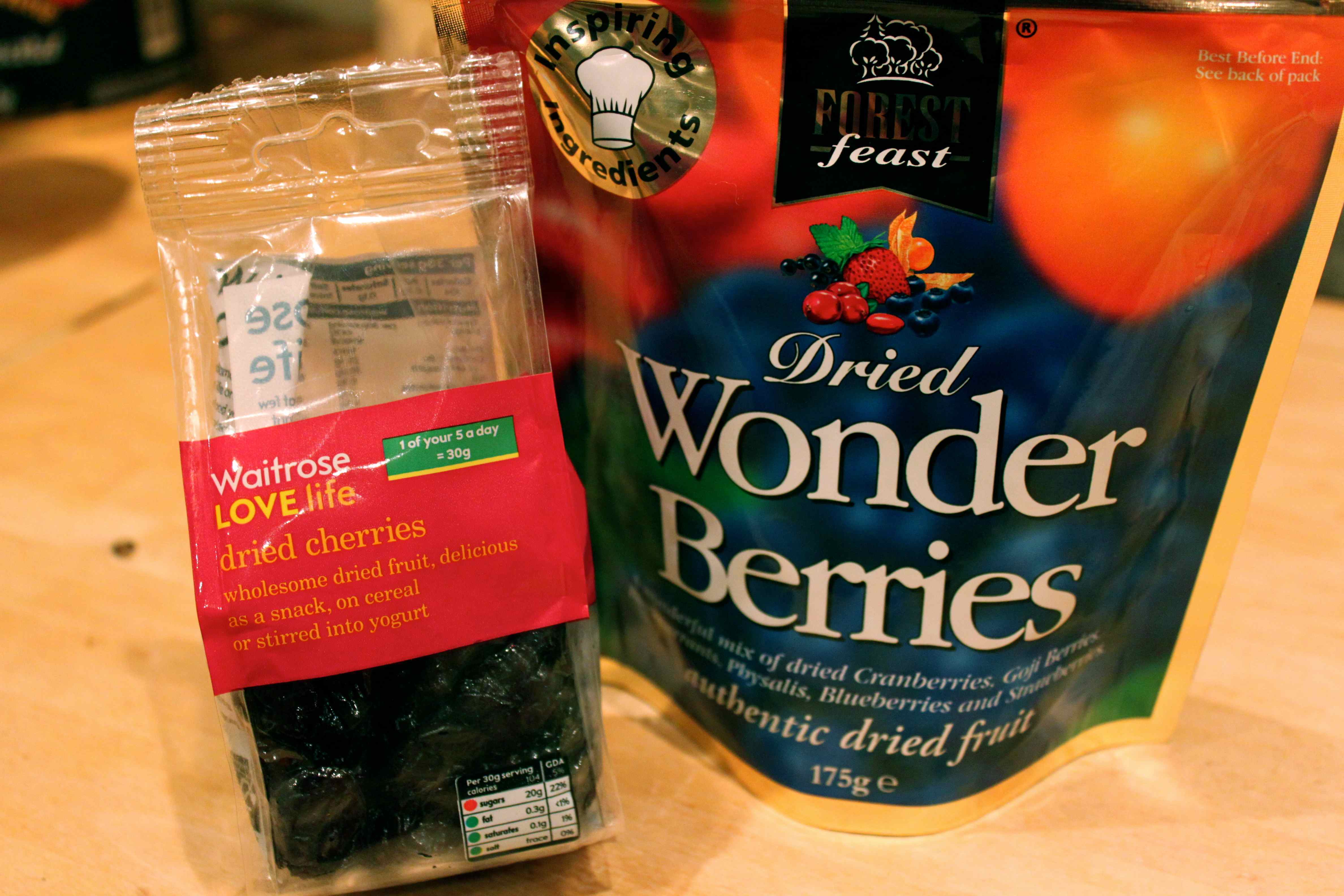 I used dried cherries which are slightly sour and a bag of mixed berries for a variety of consistency and flavour.