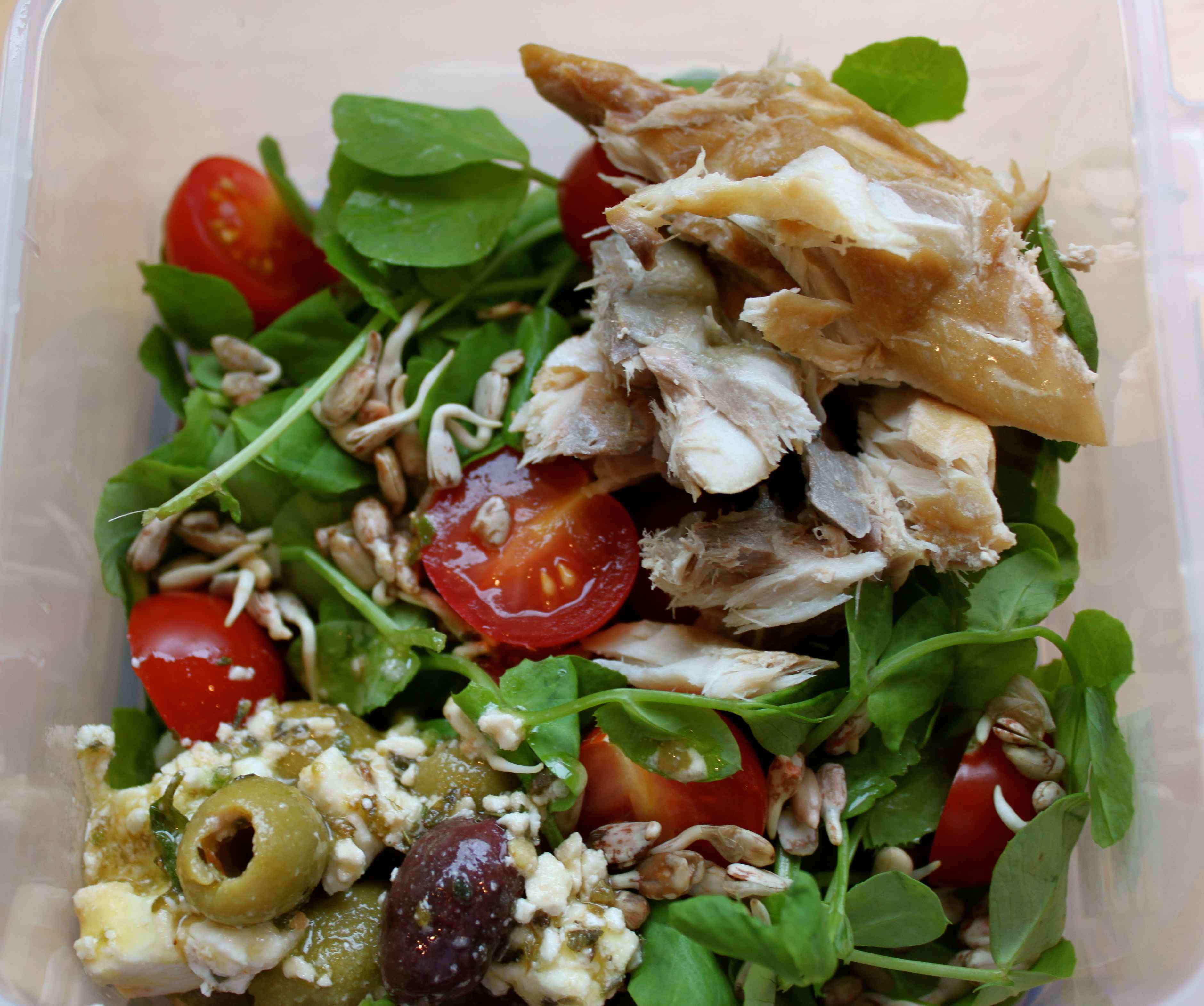 After breakfast I went Christmas shopping in Costco. I knew I would be leaving Costco at lunch time so I excelled myself today and made a salad to munch in the car; mixed salad leaves, cherry tomatoes, smoked mackerel, sunflower seed sprouts and a heaped tablespoonful of the olives I had bought last week which had some Feta cheese in the pot too. No need for a dressing as the oil in the olives did that job.