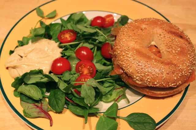 Supper was a complete snack. Bagel with smoked salmon, mixed salad greens and pea shoots, cherry tomatoes and the remainder of the tahini dressing I made earlier in the week. I used tahini dressing instead of butter or cream cheese in the bagel which worked well.