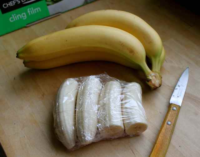 While it was cooking I cut large bananas in half and wrapped them in cling film and put them in the freezer. I bought 2 bunches of bananas (8 large bananas in each bunch) for £1:15 each in Costco last week which was a bargain but half of one is plenty as they are so huge. perfect for smoothies.