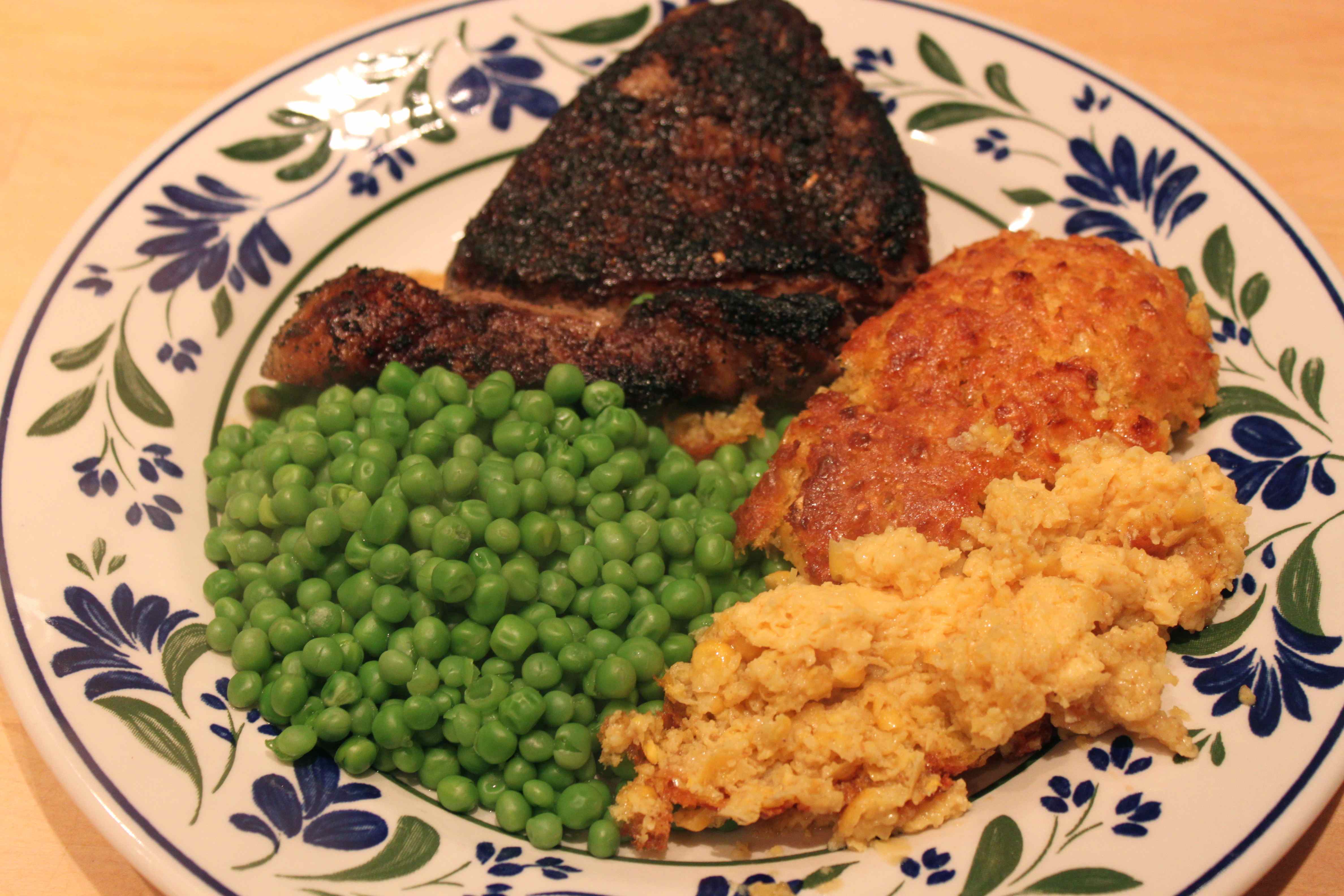 For supper we had steak. Not a regular item on the menu chez moi but I am trying to clear down my freezer and I found 2 good sized rump steaks in there. We had been so healthy all day I though a little red meat would go down well. We cook it using a blackened steak seasoning so it comes out full of flavour. I have been wanting to cook a Corn Pudding I saw on Kath Eats recently for a while and thought it would go well with a spicy steak as it was described as being light and sweet. It was very easy and tasted good.