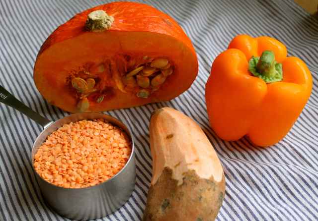 - Add the red lentils and all the orange veg (squash, sweet potato and orange pepper)