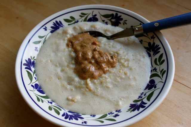 Everything I ate today took 20 minutes or less to prepare and cook. Breakfast was an old favourite; banana porridge and almond nut butter with dried fruit.