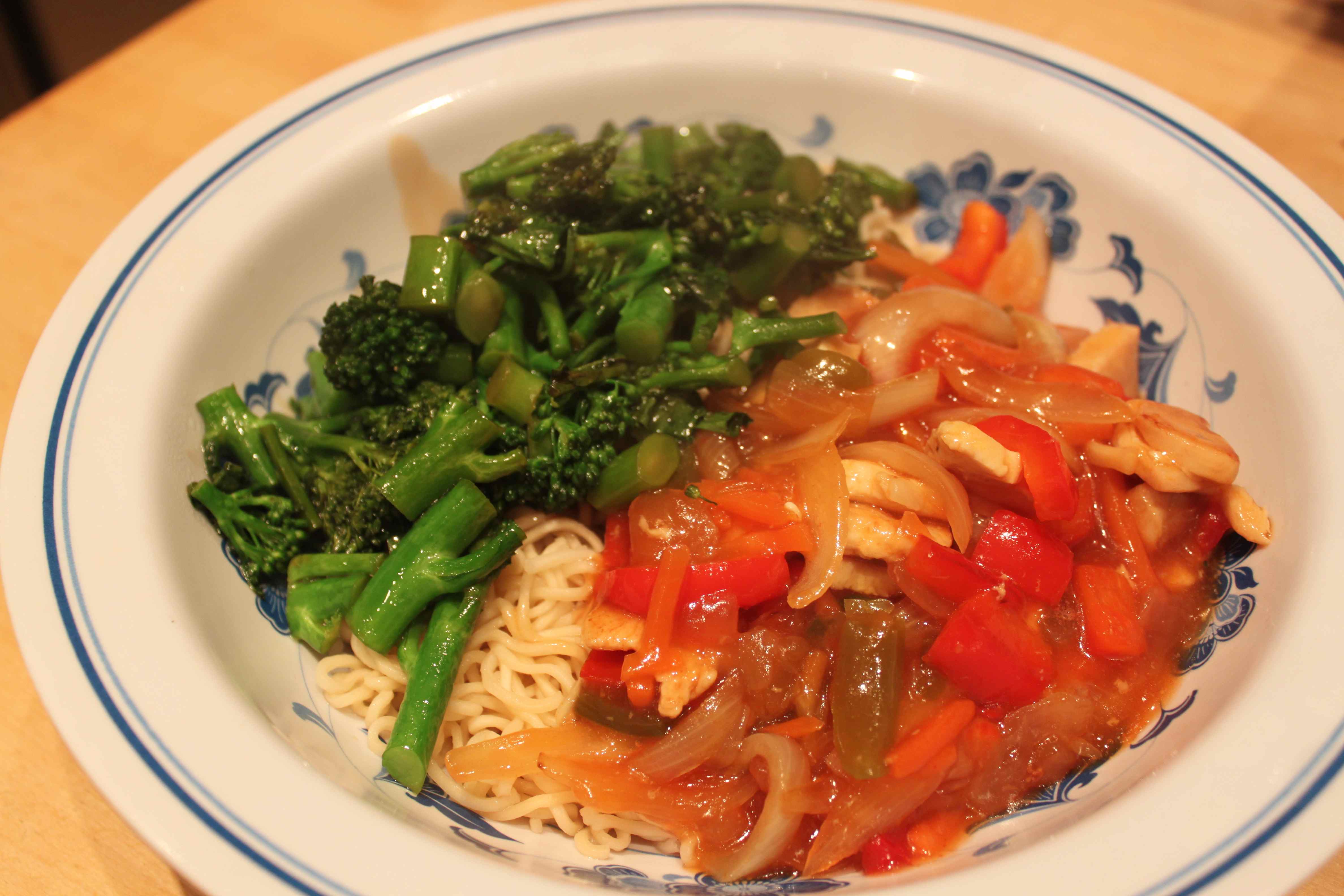 - Serve by putting the noodles in a large bowl and then top with the sweet and sour chicken and the broccoli.