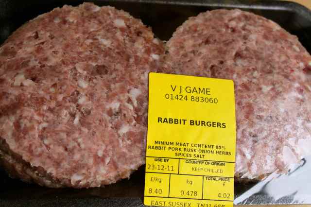 • I bought the rabbit burgers from VJ Game at the Cranbrook Farmers market on Saturday. They also sell at Rolvenden and many others such as Brede, but I just go to Rolvenden and Cranbrook.