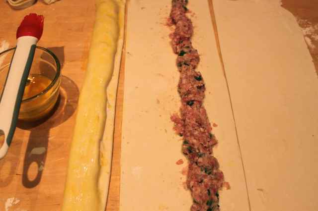 - Put the egg in to a small bowl and whisk. Brush the whisked egg along one edge/length of the pastry and fold the pastry over the meat and on to the eggy edge.
