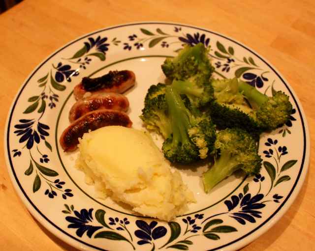 Supper was quick and easy comfort food. I had bought some wild boar chipolatas from the farmer’s market.