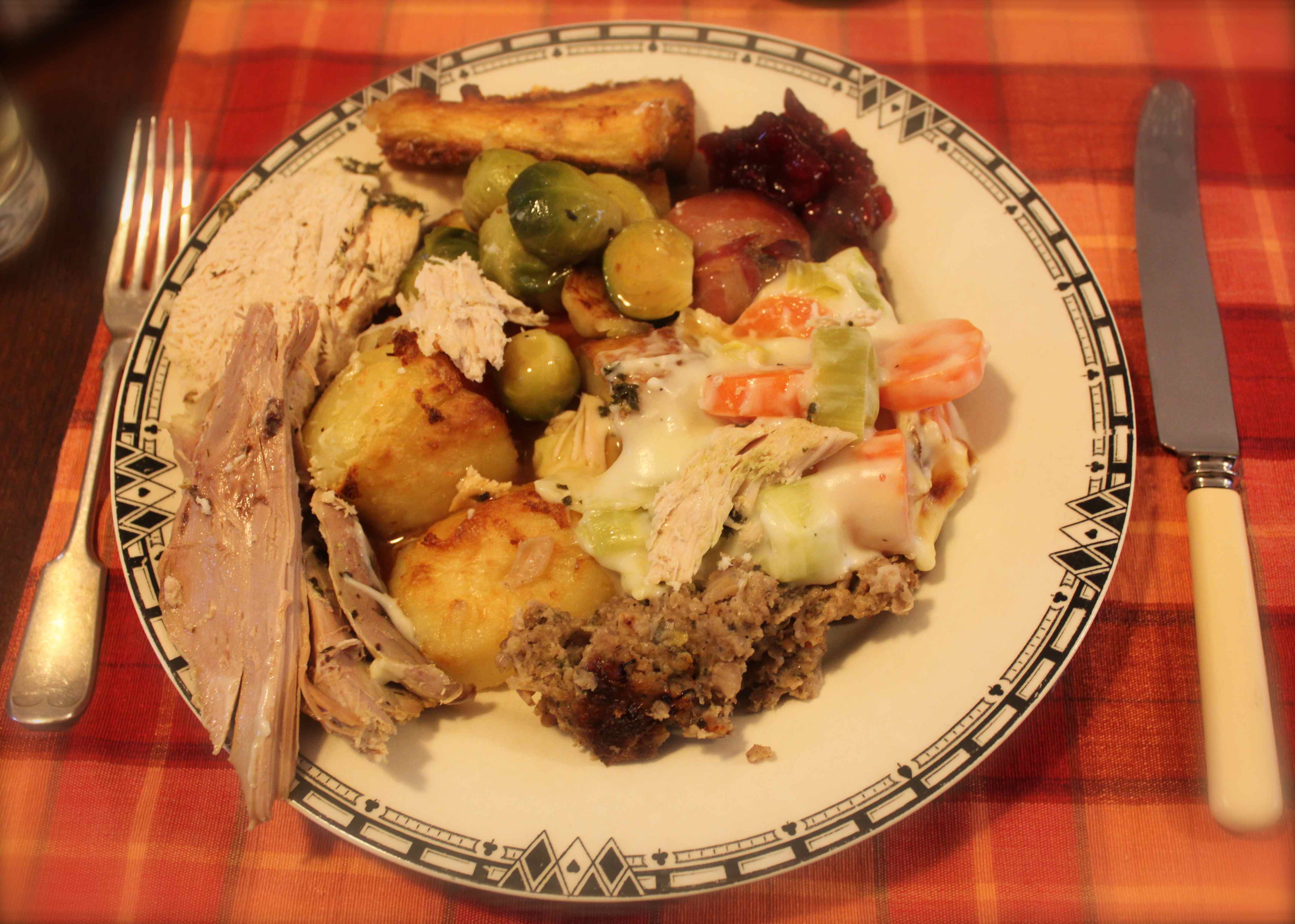 followed by the full works: roast turkey, sausages, bacon wrapped around sausage meat, a vegetarian and a meaty stuffing, roasted potatoes, parsnips and carrots, brussel spouts, leeks and carrots in white sauce (one of our traditions), cranberry sauce (made by me), bread sauce and gravy. YUM!