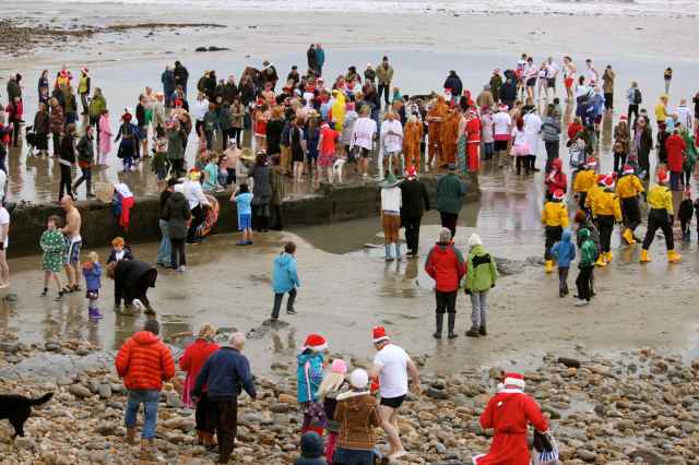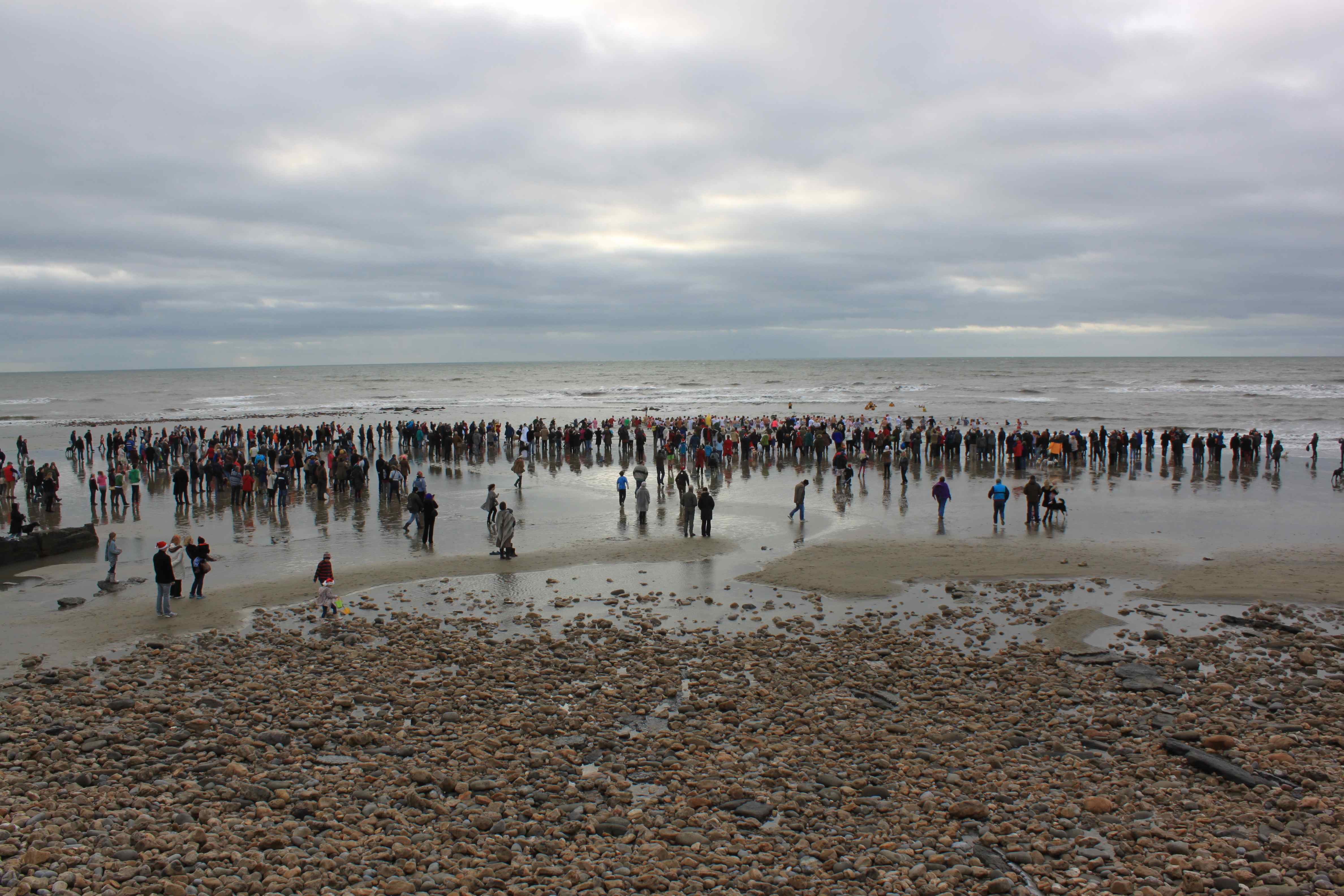 Most of us then went to Charmouth Beach, which is part of the Jurassic Coast which is a World Heritage site. You can literally walk along the beach and if you are keen eyed, pick up fossils. Real ones. But we did not go to collect fossils but for the annual Christmas Day swim. Not as participants you understand, but as spectators.