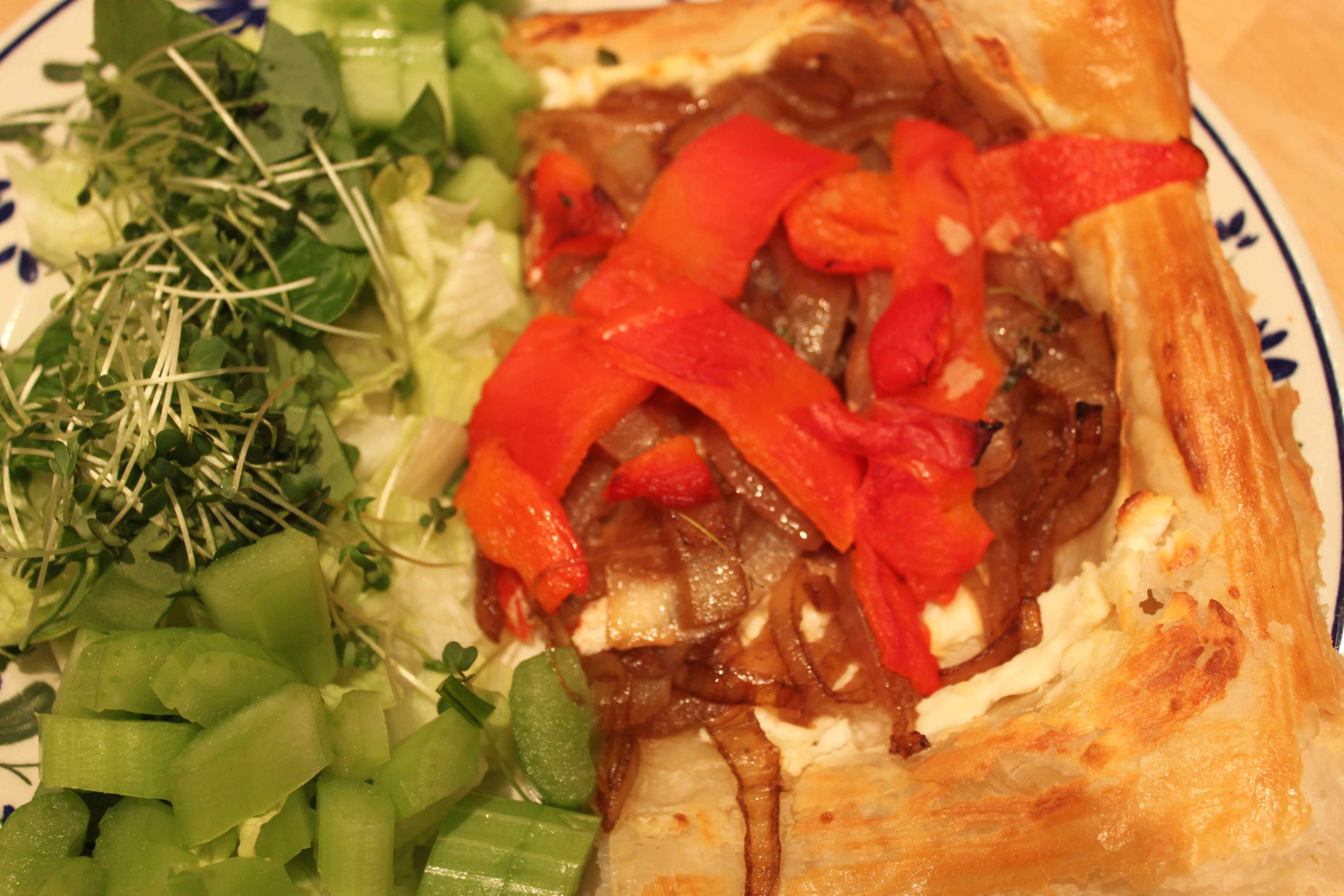 In summary, you caramelise 3 onions, roast and then skin 3 red peppers, roll out some flaky pastry, spread the pastry with goat’s cheese, pile on the onion, thyme and pepper then bake for 20 minutes.  Easy to make and it tasted delicious.  I served it with an undressed green salad and we all really enjoyed it.  Give it a go.
