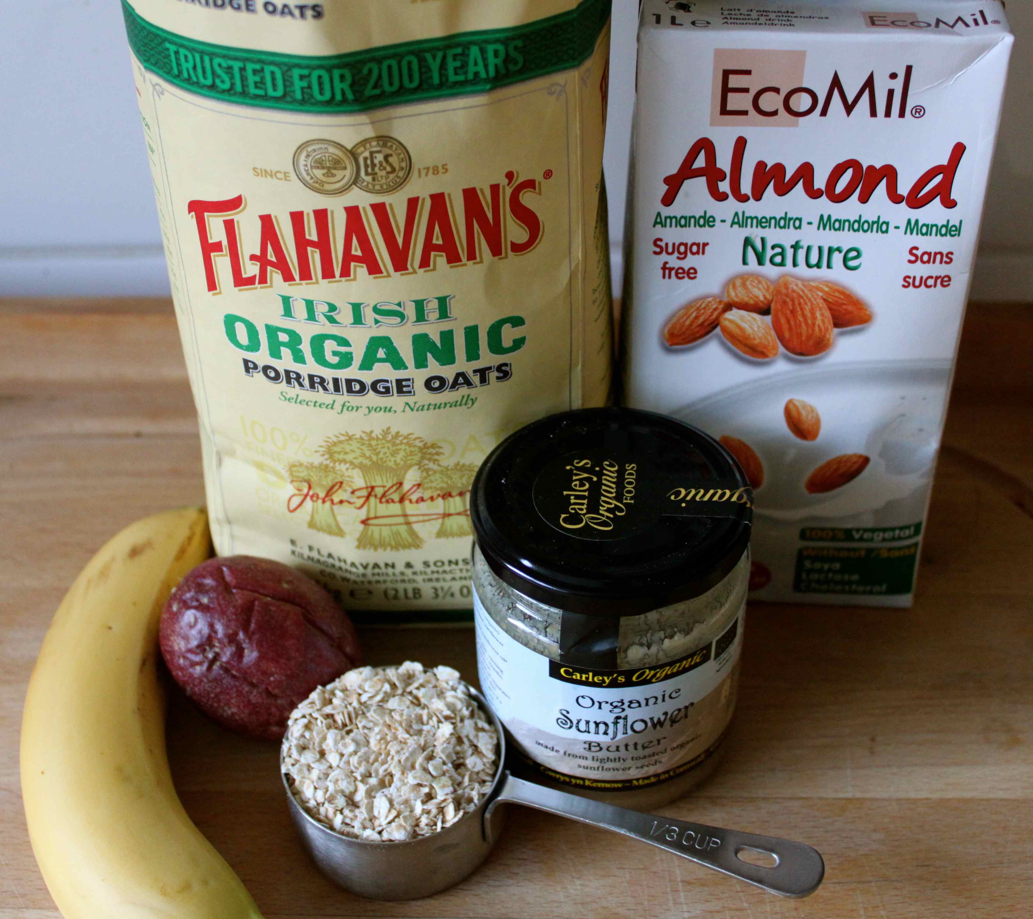 An old favourite of 1/3 cup of oats, 1 cup of almond milk, 1 banana, 1 passionfruit and 1 tsp chia seeds.  When I took the photo of the ingredients I was going to use sunflower seed butter but as I put the ingredients in the blender, I thought chia seeds would work better.  It was satisfying and delicious.
