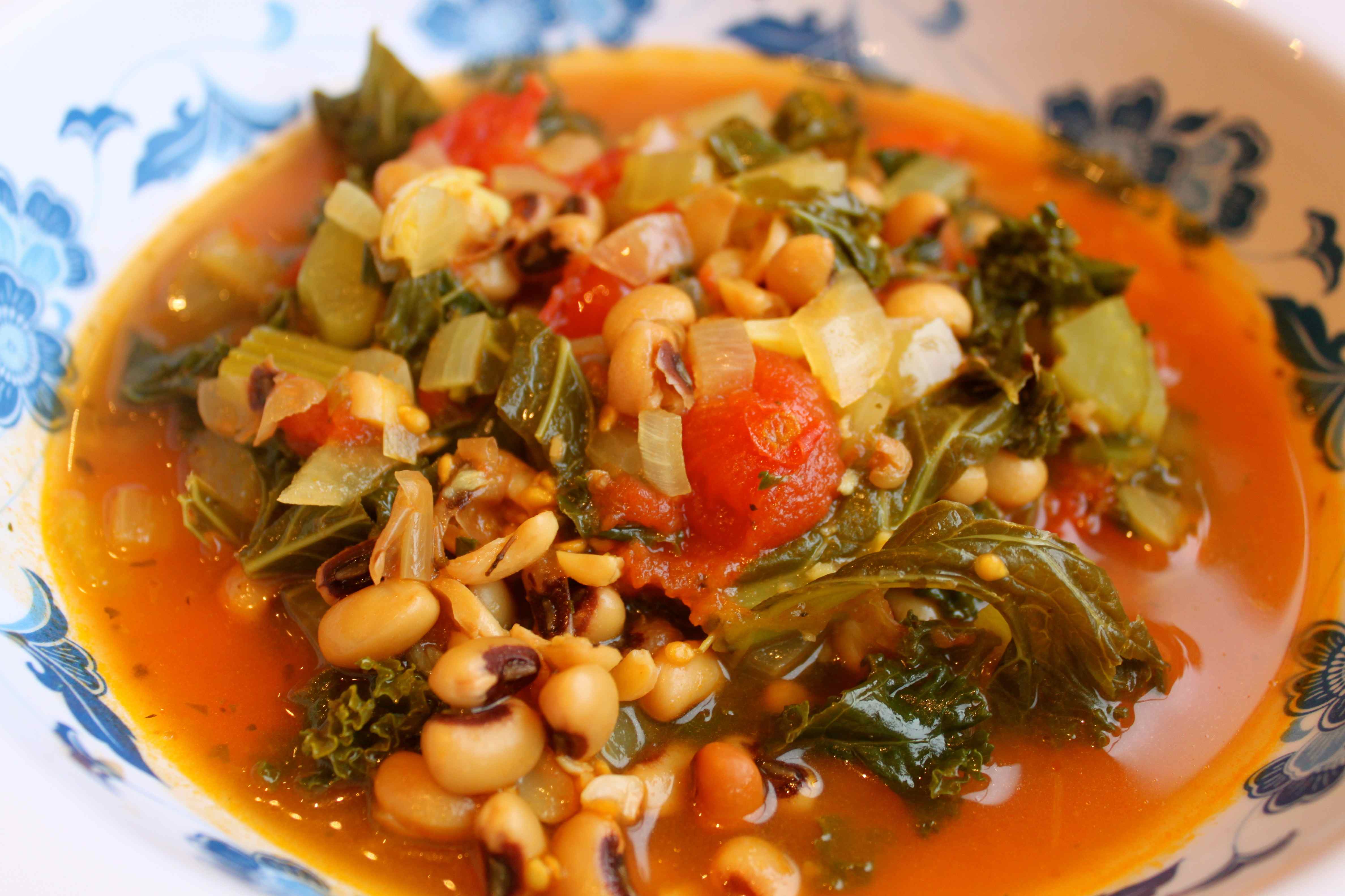 For lunch I made an incredibly healthy and very tasty soup. I have come across many blogs that posted new year recipes containing black eyed peas/beans as they are considered to be good luck. Apparently (according to Wikipedia) this began as a Jewish tradition and is now common in the USA, especially the South. The beans resemble coins and swell when you cook them which suggests your money grows. It is luckier to eat them with green vegetables such as collard greens or kale as the folded leaves resemble paper money. Well, I am a couple of days late but hopefully I will still be lucky.