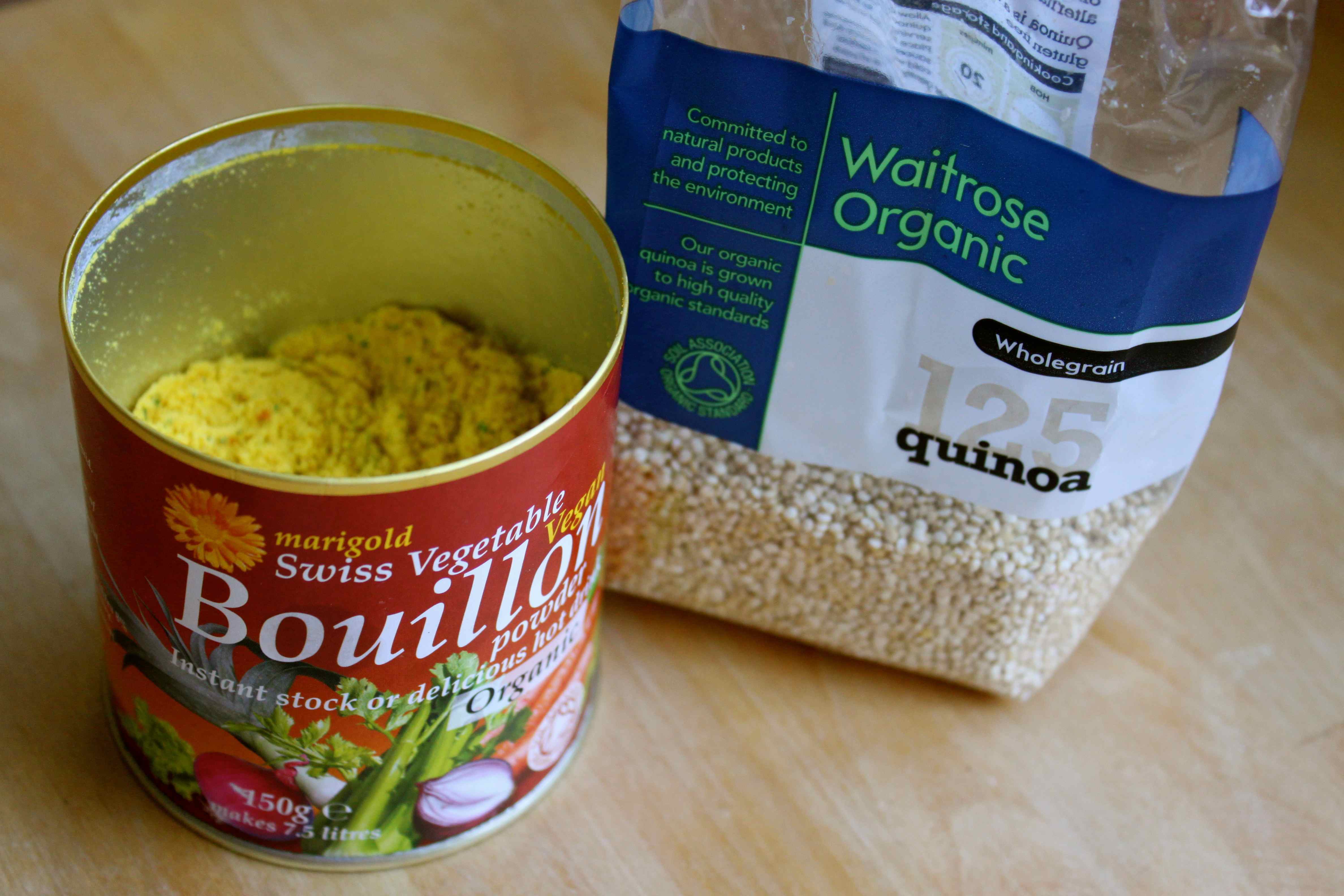 • Make up the quinoa in a saucepan according to the packet instruction.  Mine said to use 3 x as much water as quinoa, bring to the boil and simmer until water is absorbed which takes about 20 minutes.  Add bouillon powder for additional flavour when you add the uncooked quinoa to the water .  When cooked, allow to cool slightly.
