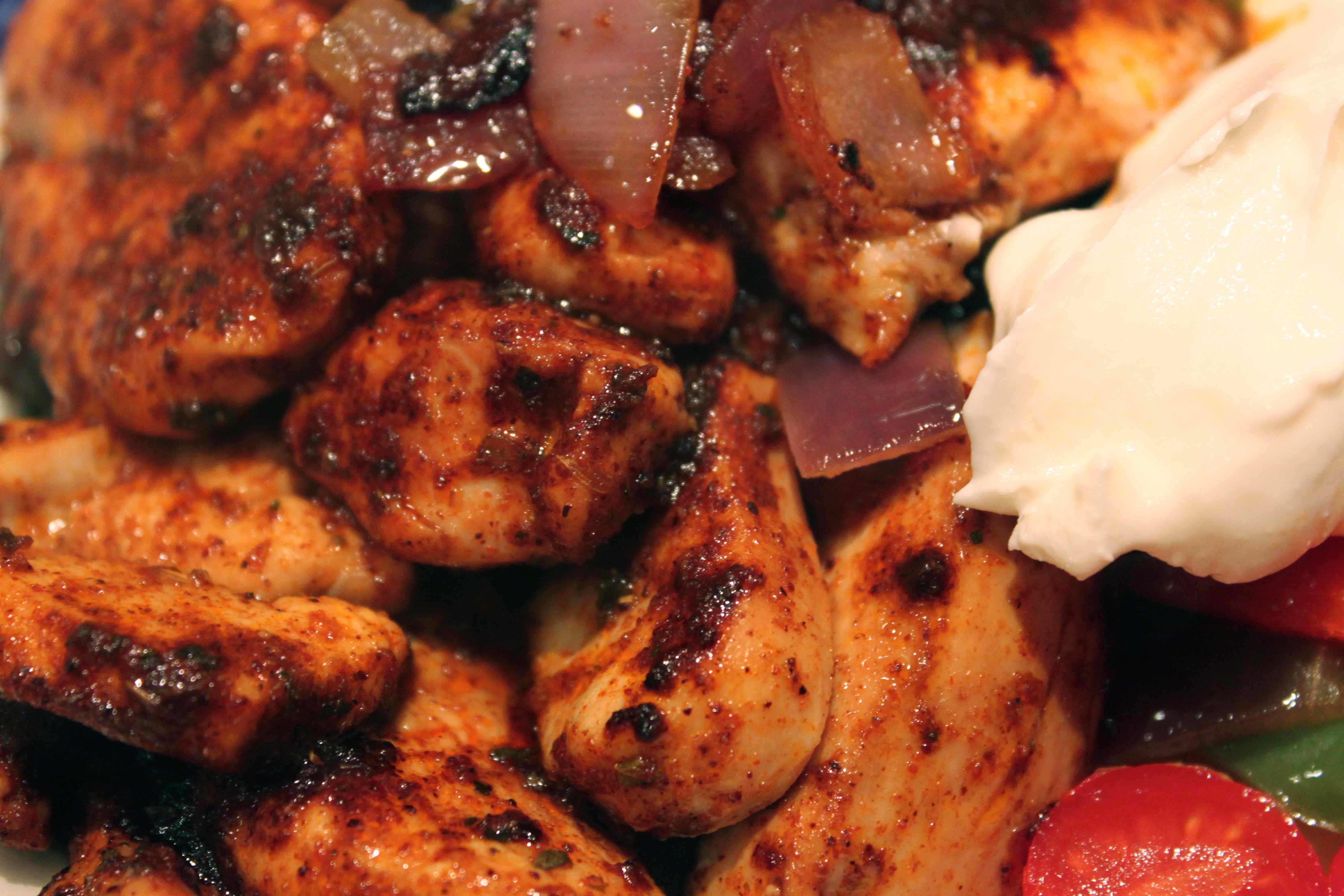 I ate a whole chicken breast, Fajita seasoning, 1 tbsp oil used for frying the chicken, red onion and peppers and I served it with cherry tomatoes and 1 heaped tbsp Greek yogurt.
