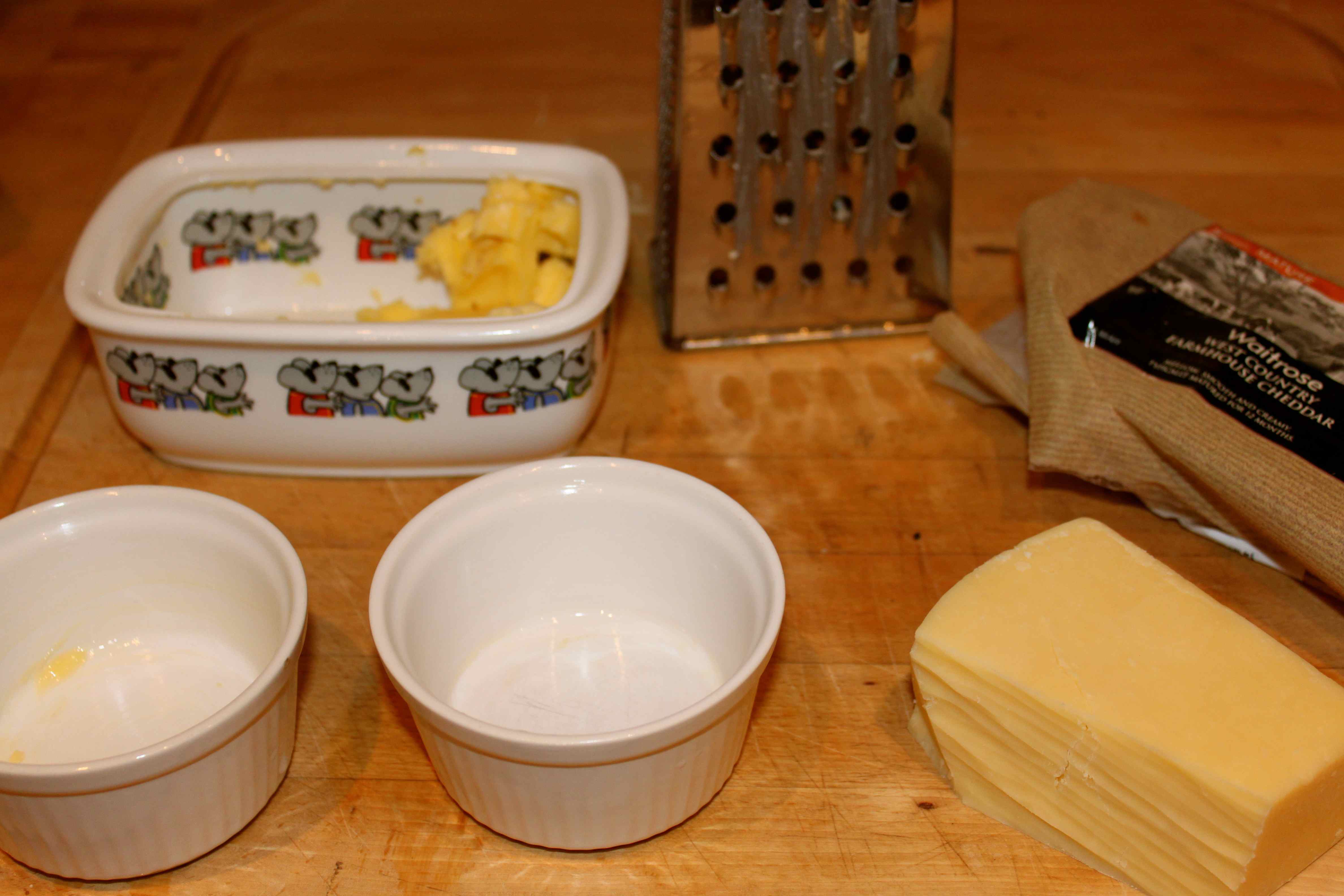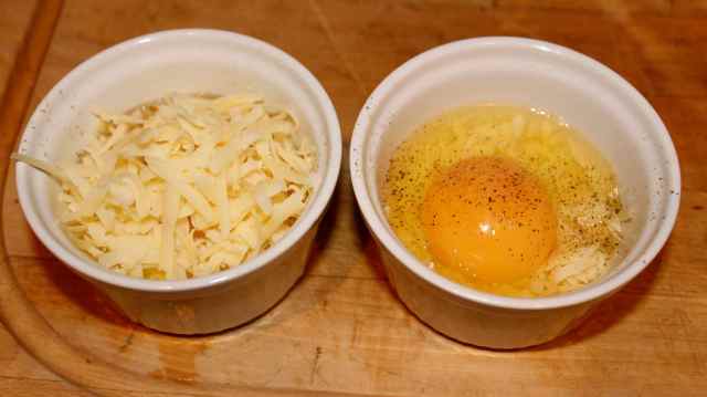 Place ¼ of the cheese in the bottom of each ramekin.