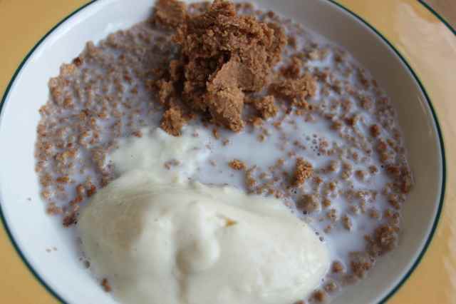 True to her word, she was up with the rest of us at 7am so she could say good-bye to her Daddy and brother.  I had Grape Nuts again today, but a whole bowlful this time.  So 50 g Grape Nuts, 100ml coconut milk, 2 heaped tbsp vanilla soya yogurt and 1 tbsp coconut almond butter.  The drop in temperature has set the nut butter.  I assume the coconut oil has gone hard.  It still tastes lovely but I prefer the drippy consistency.  This was 11 WW points.