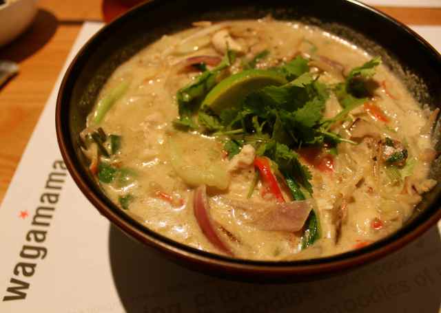 I had Itame which is “rice noodles in a spicy green coconut and lemongrass soup topped with stir-fried chicken or fried tofu, beansprouts, chillies, red and spring onions, bok choi, peppers and mushrooms. garnished with coriander and lime”.  I chose chicken.