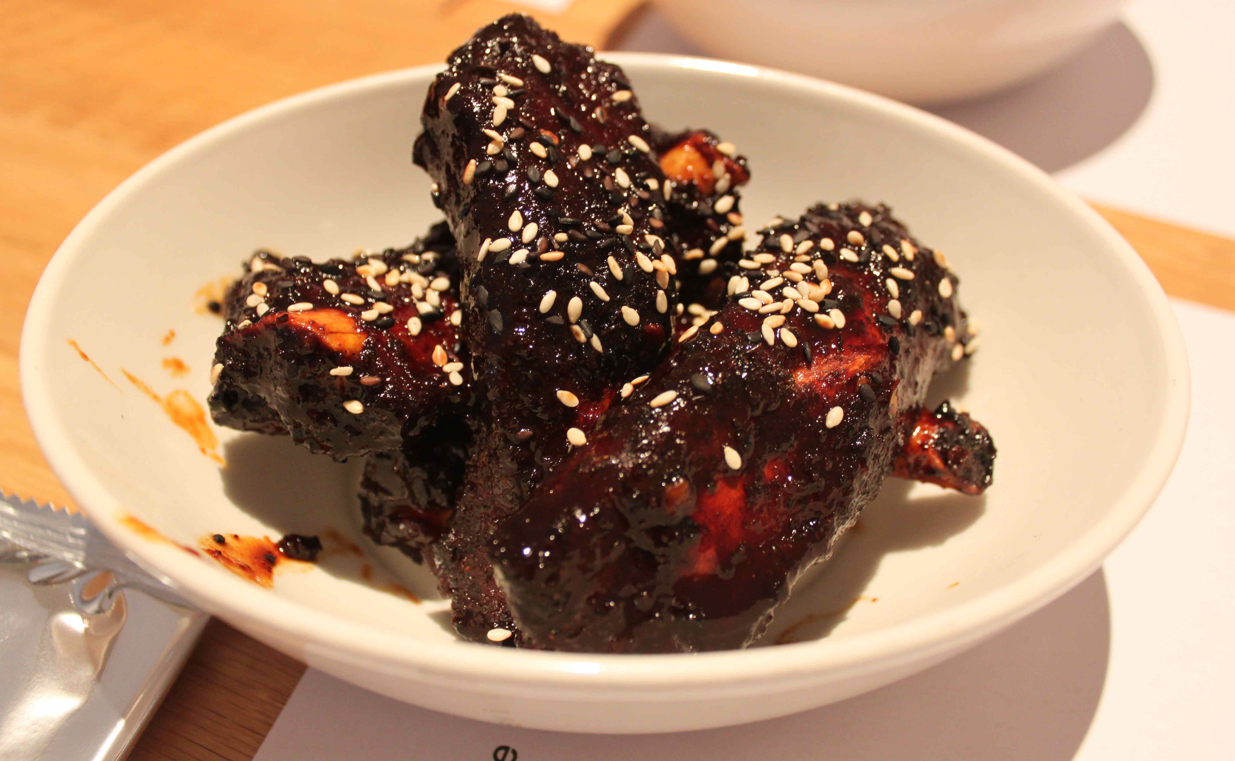 One Wagamama custom is to bring the food when it is cooked, regardless of whether it is a main meal or a side dish.  I had only just begun to nibble at the pork when my main came.  So I ate them both at the same time.