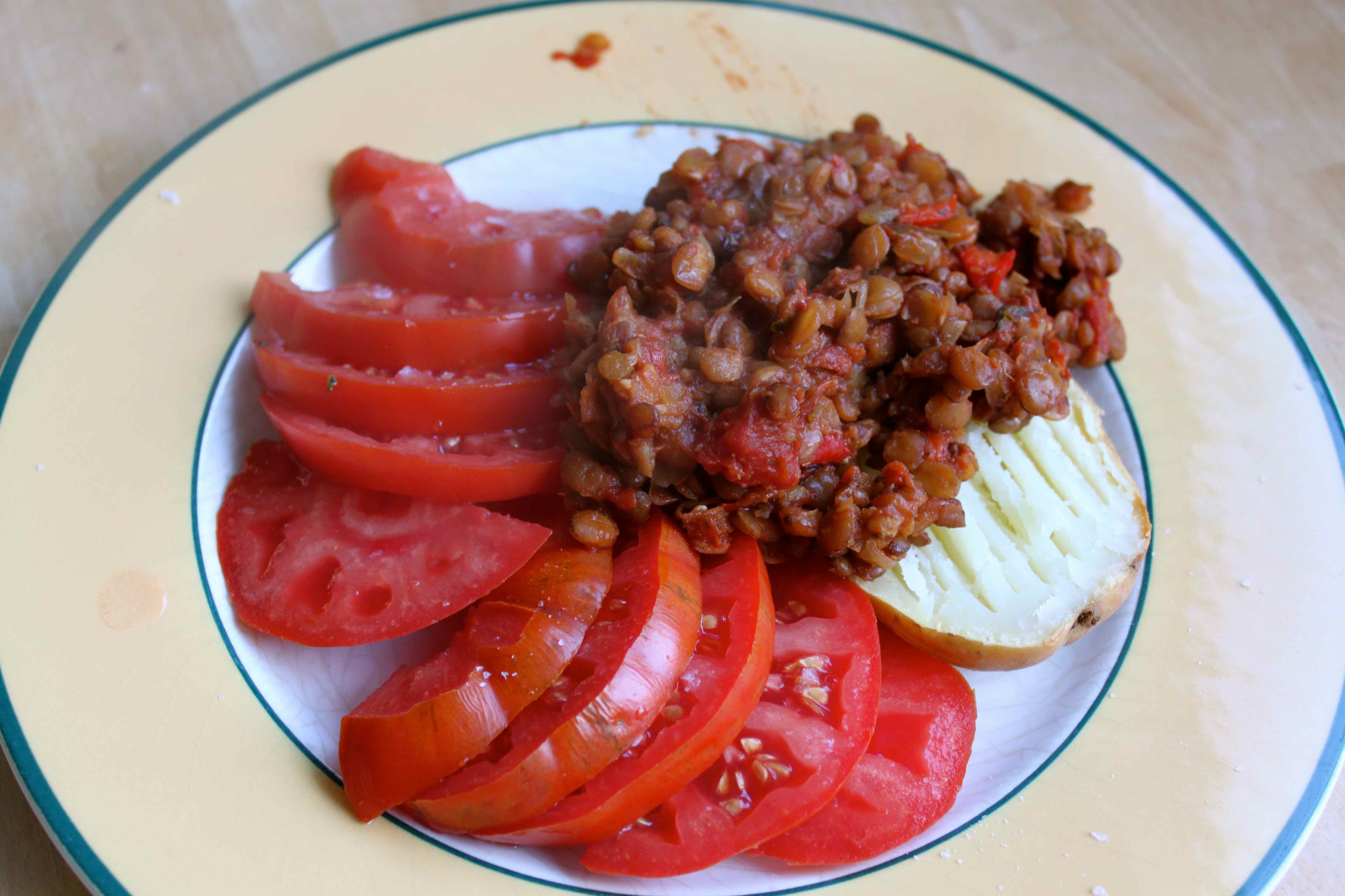 I served this with ½ a baked potato and a large fresh tomato. The potato cooked in the oven alongside the lentil sloppy joe. The lentils went very well with a large and juicy tomato.