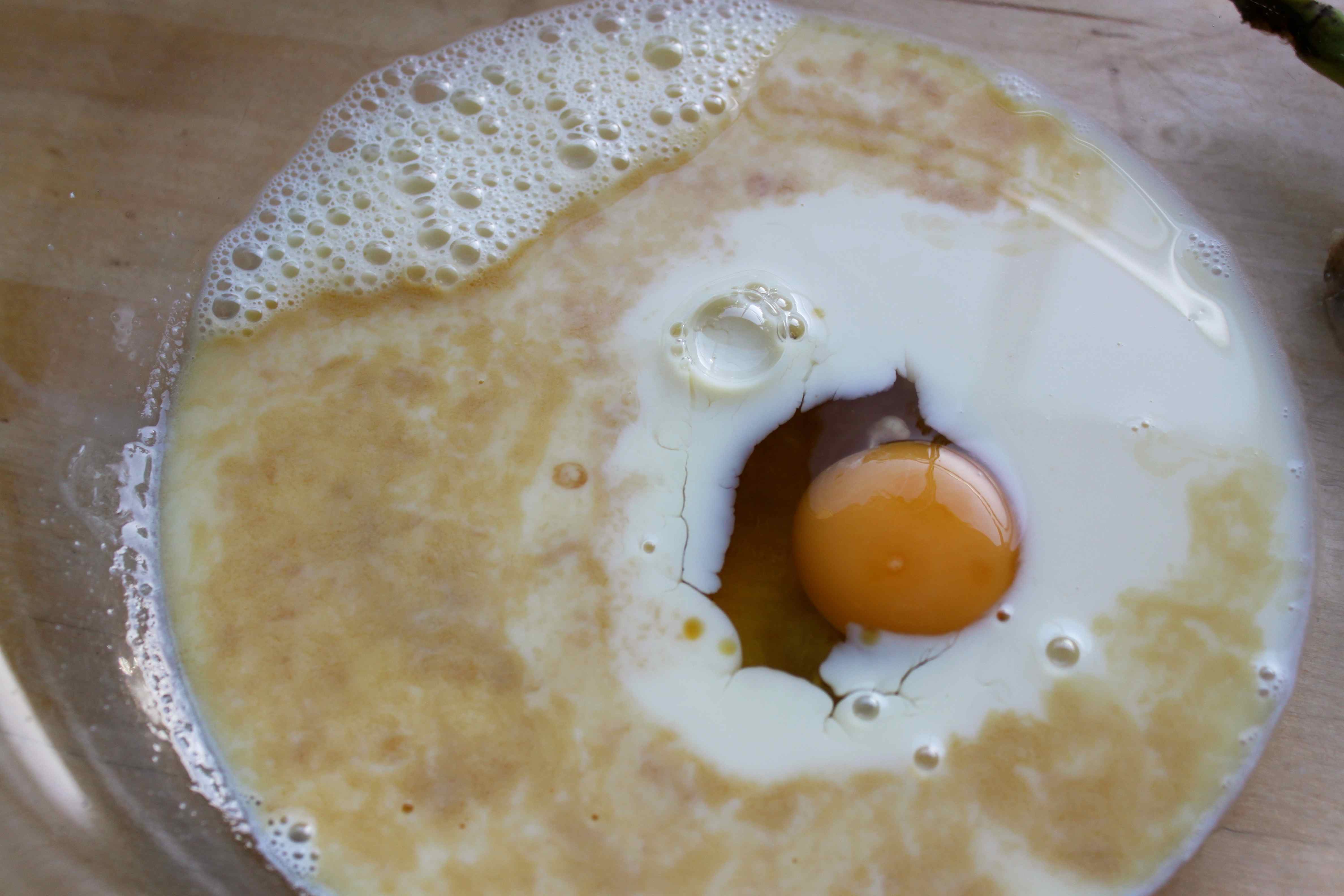 In another bowl combine the wet ingredients and whisk to mix well: the remaining honey, milk, egg and vanilla extract.