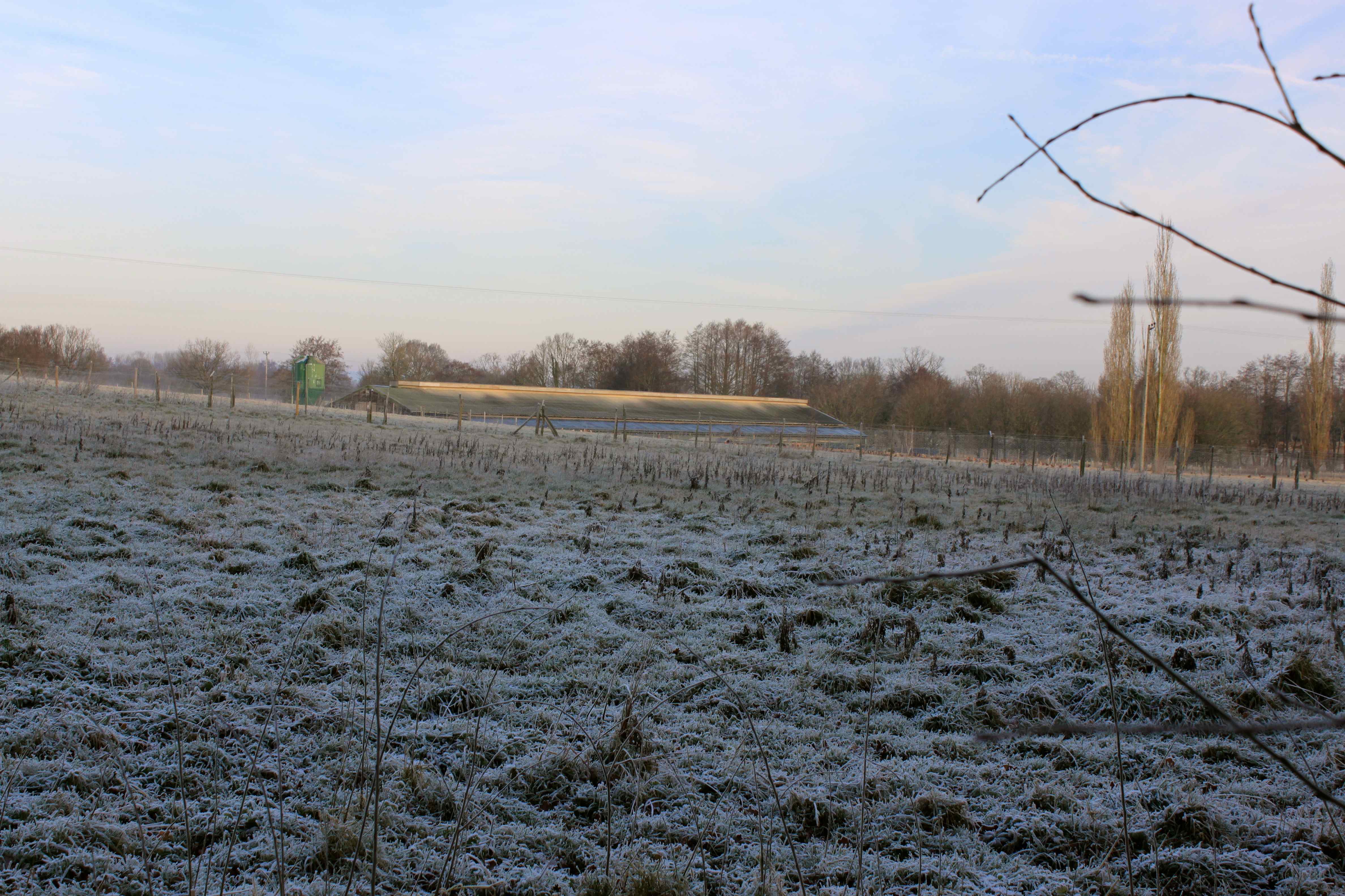 One of the biggest egg producers in the country has a free range chicken farm next to the woods. No chickens out today. Walking beside it reminds me of a prison or camp. Quite creepy.