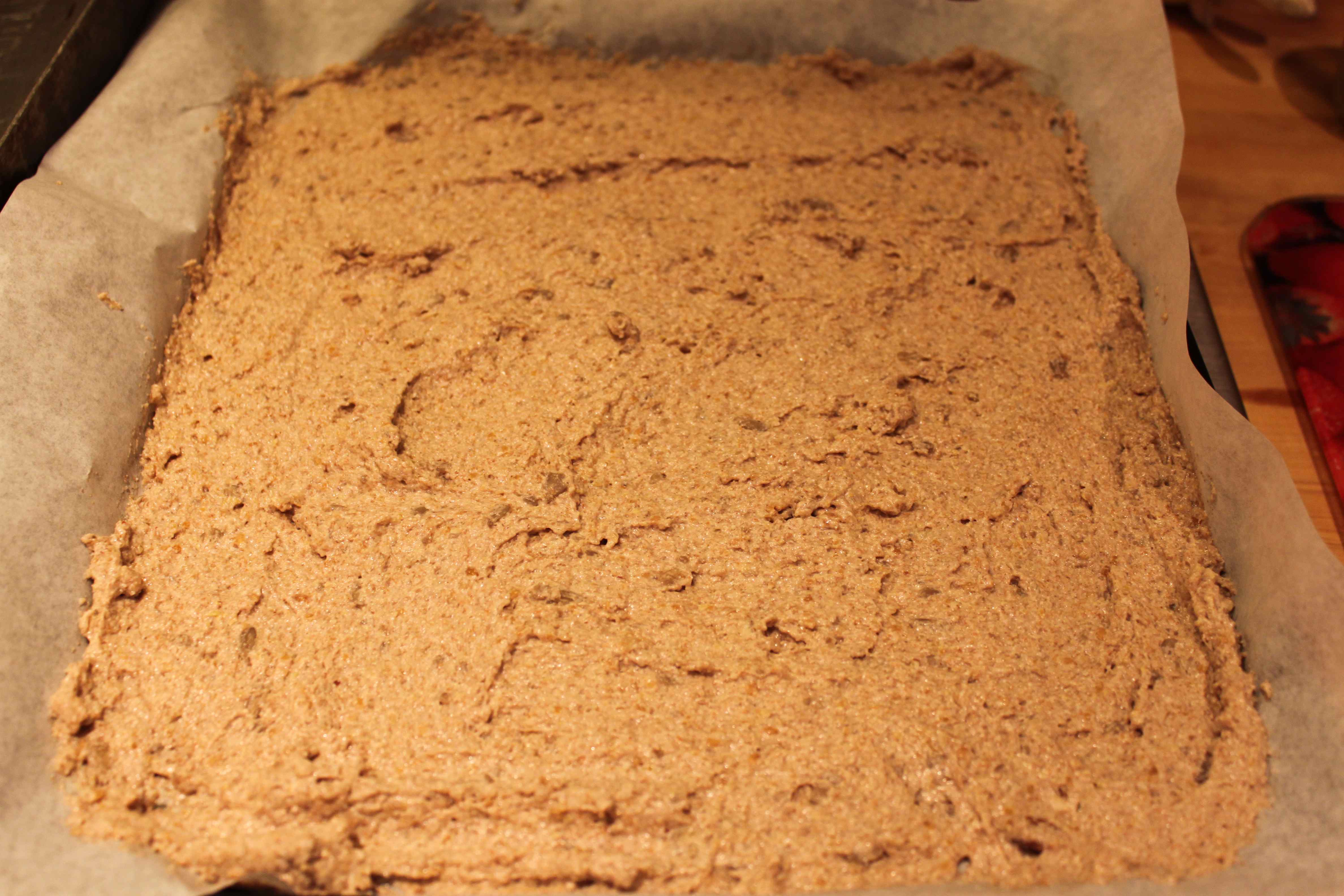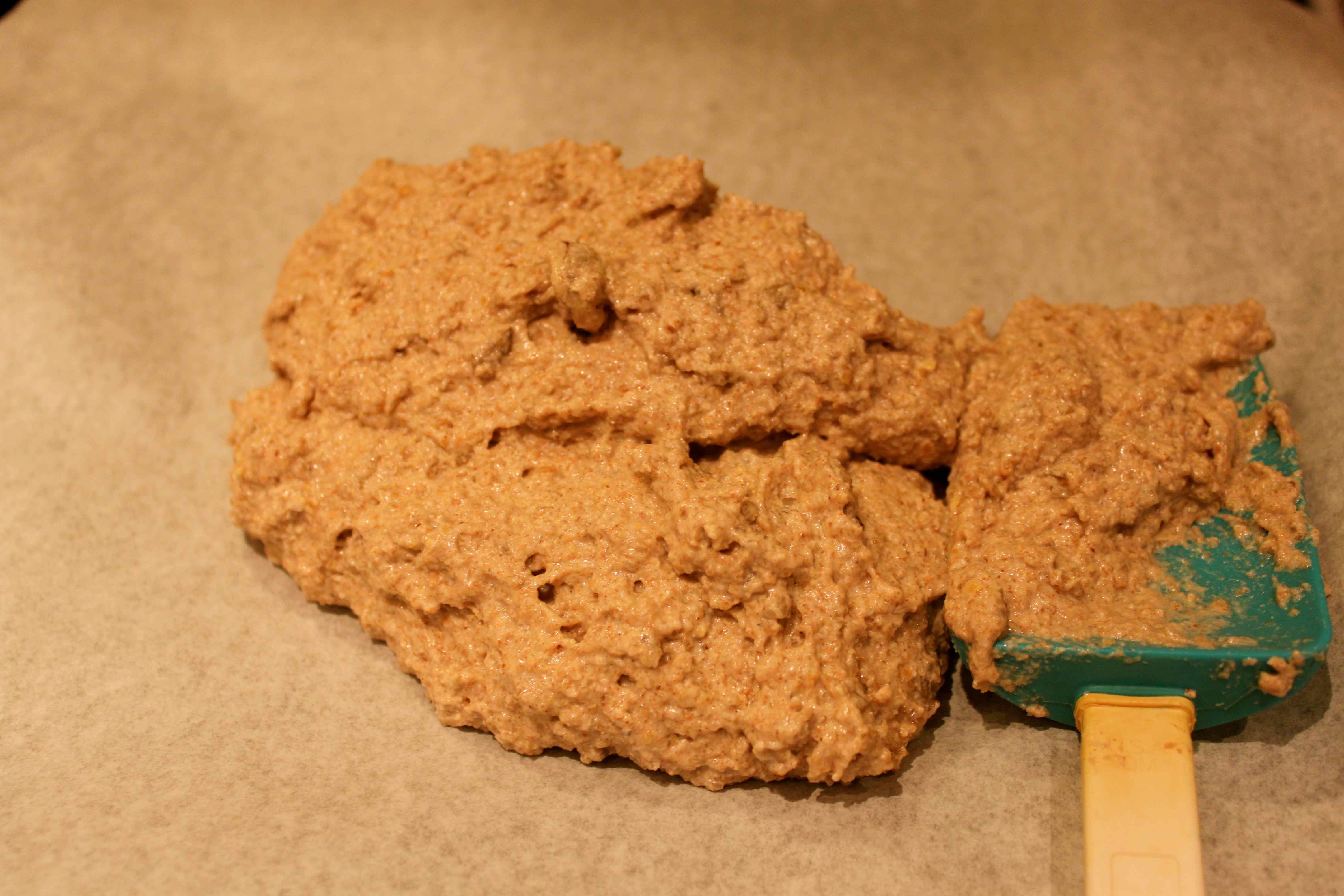 Spread the dough over the paper, as evenly as possible. I used a spatula and then a knife.