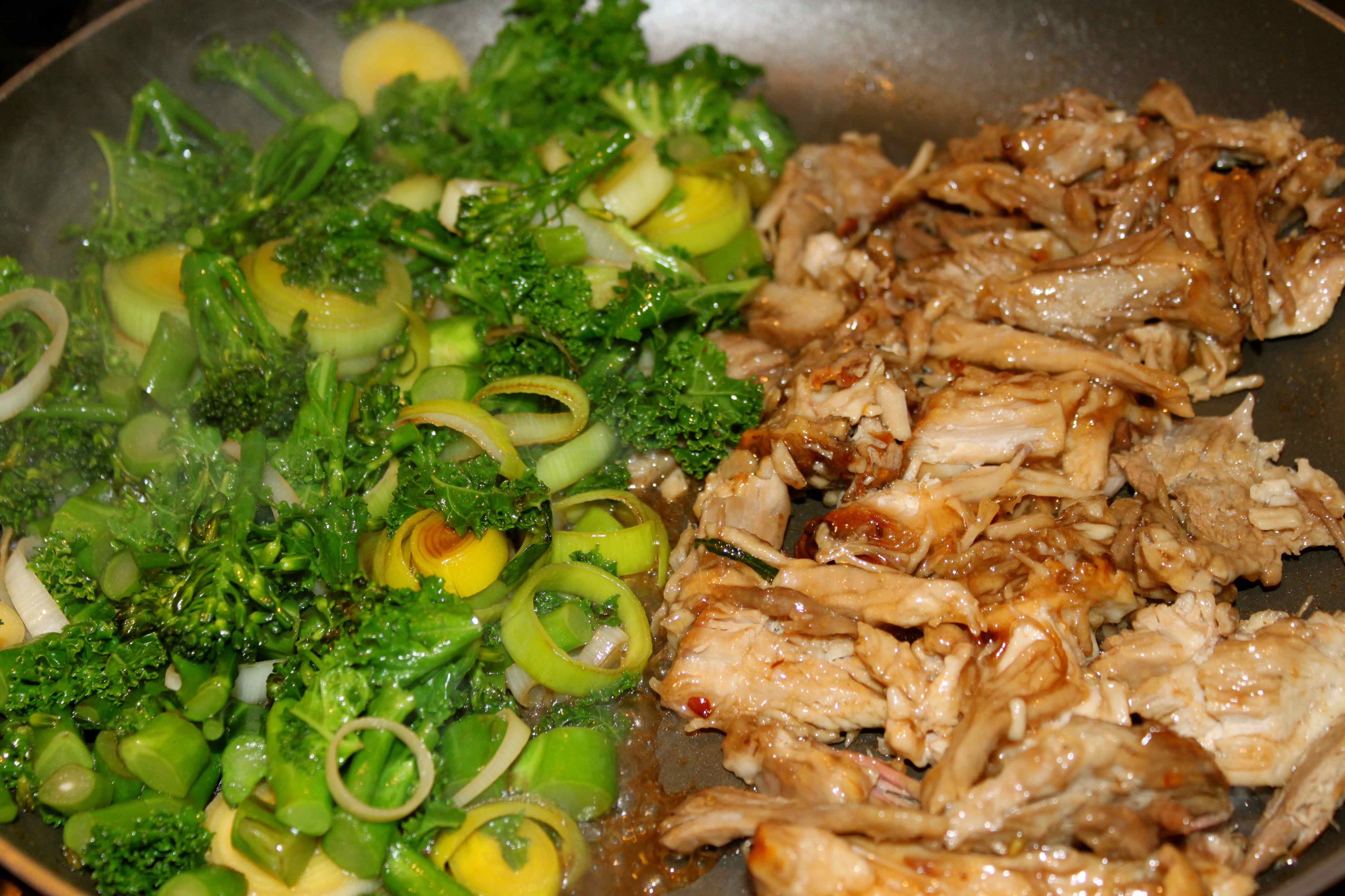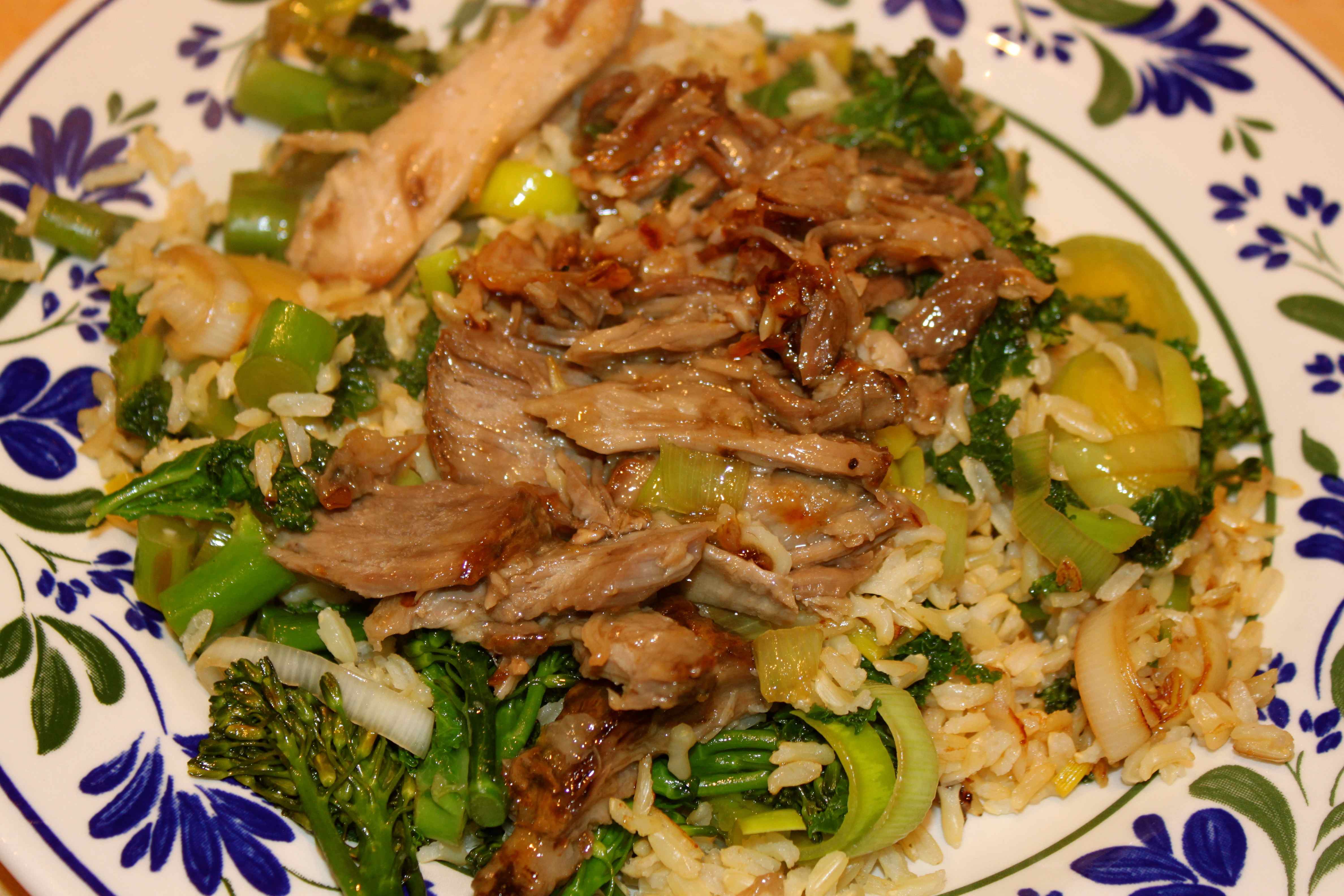Dinner was more leftovers. I am rather fed up with my leftovers, even though they are tasty. I am looking forward to cooking fresh foods again this weekend and I will make smaller quantities. I used up the last of the pork from Sunday and some left over brown rice. I fried tender stem broccoli and a leek with oyster sauce and I warmed the pork up with some plum sauce.