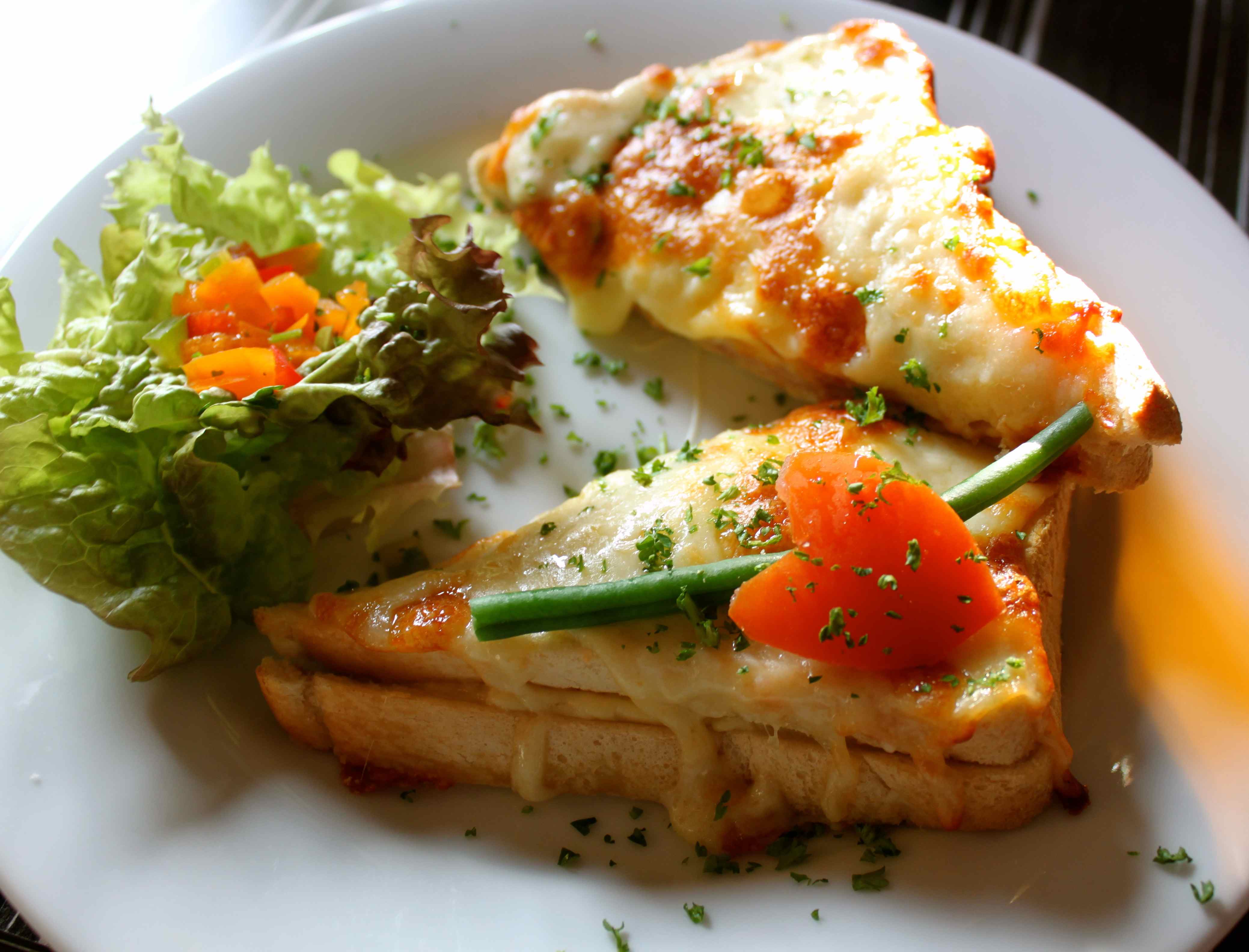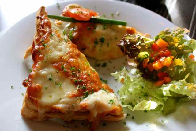 A yummy cheesy treat, perfectly cooked. Lots of cheese and good ham but not too rich. Just. It was delicious.