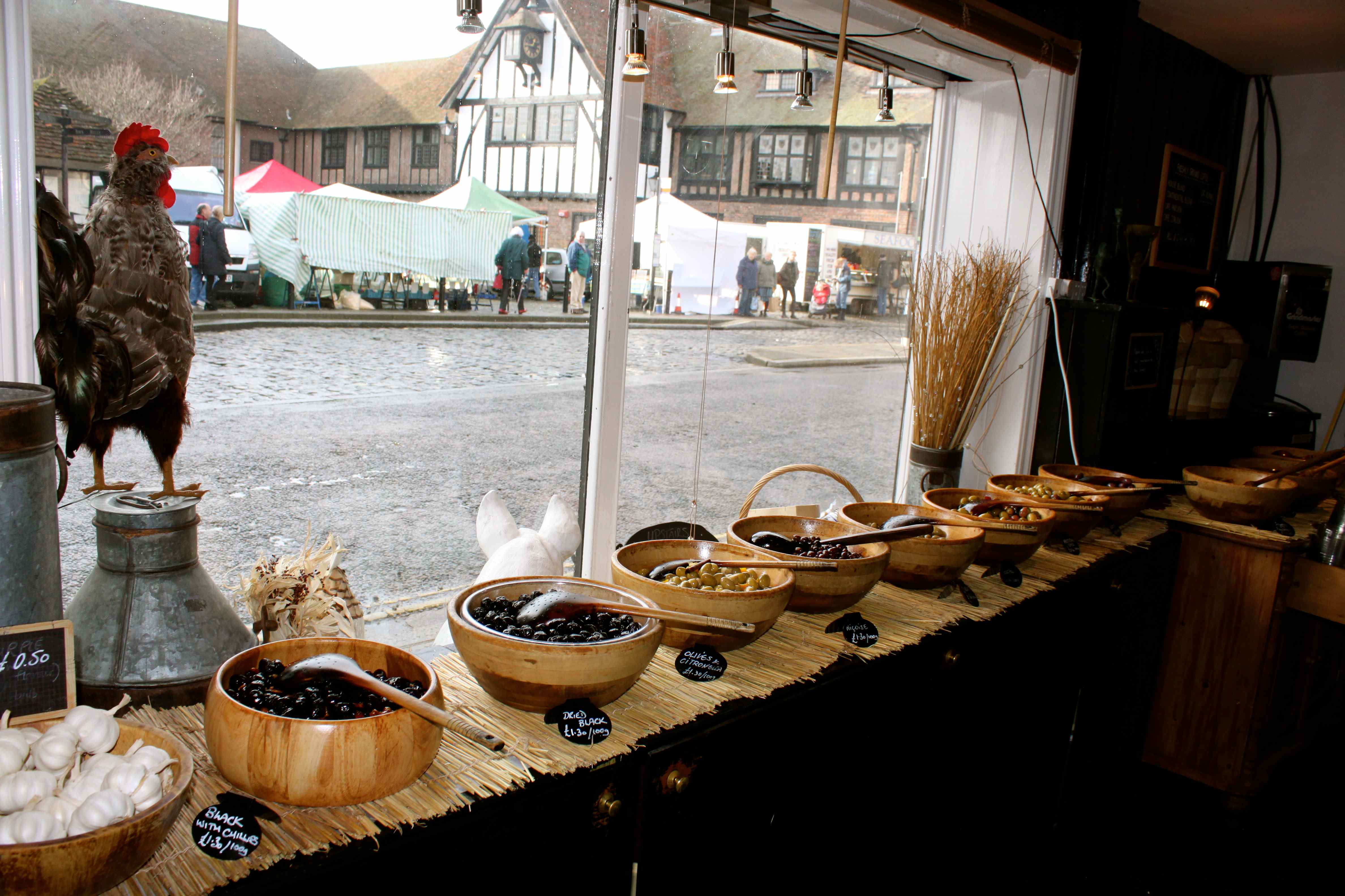 No Name Olives and you can see the weekly market through the window,