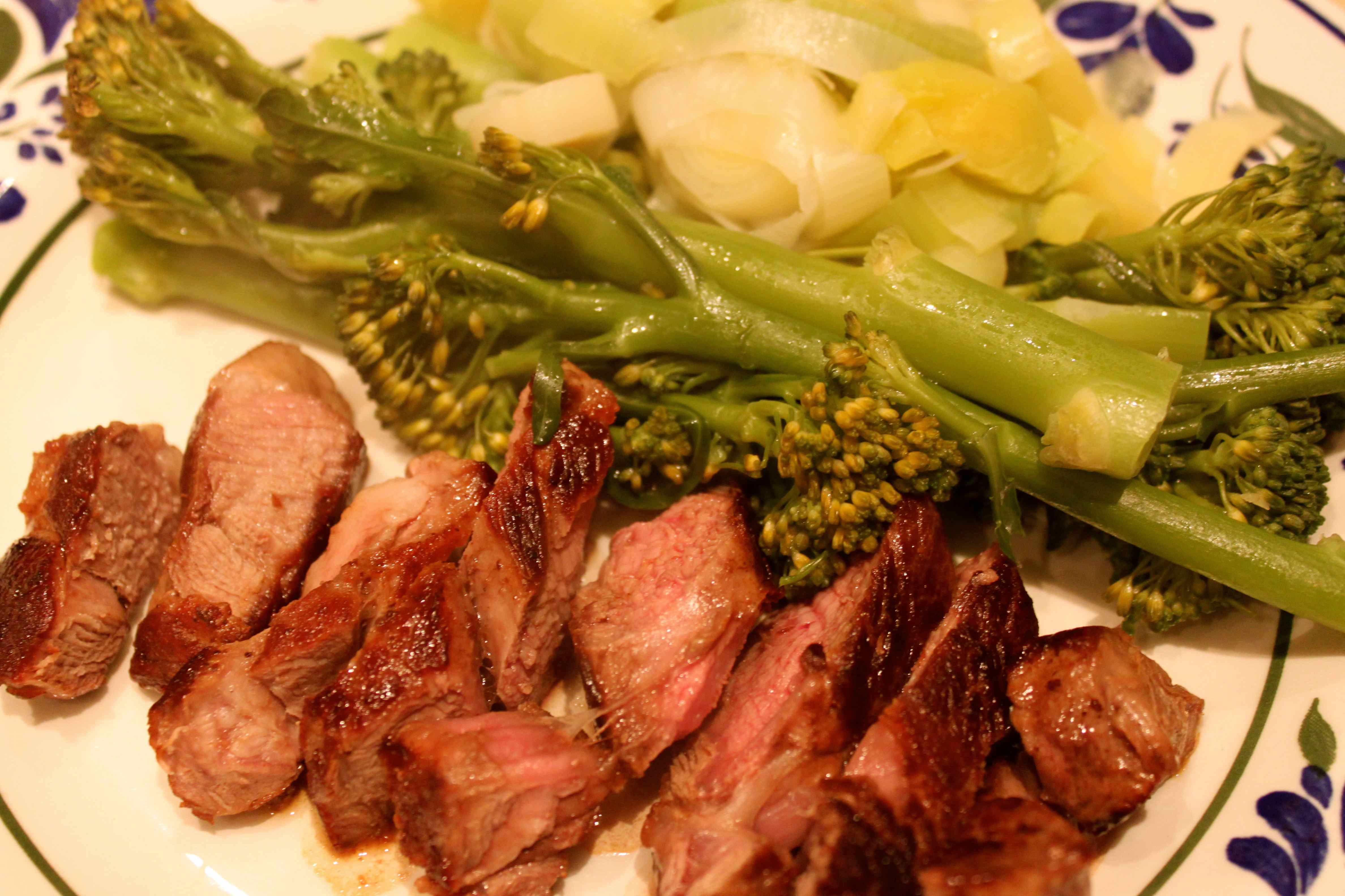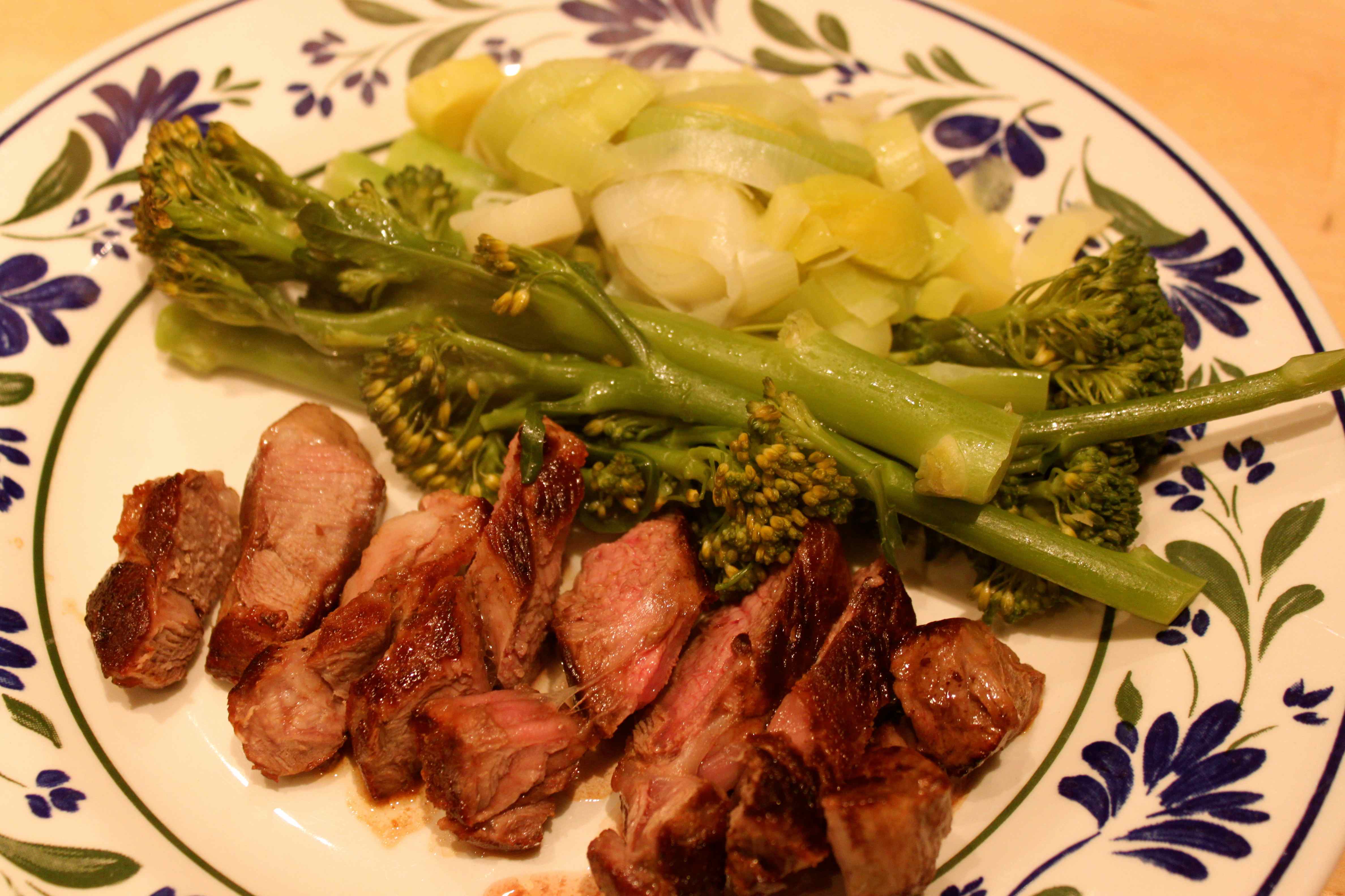 Grilled lamb steak with fat cut off (5 points), steamed leek and tender stem broccoli which I had with 2 tsp butter.
