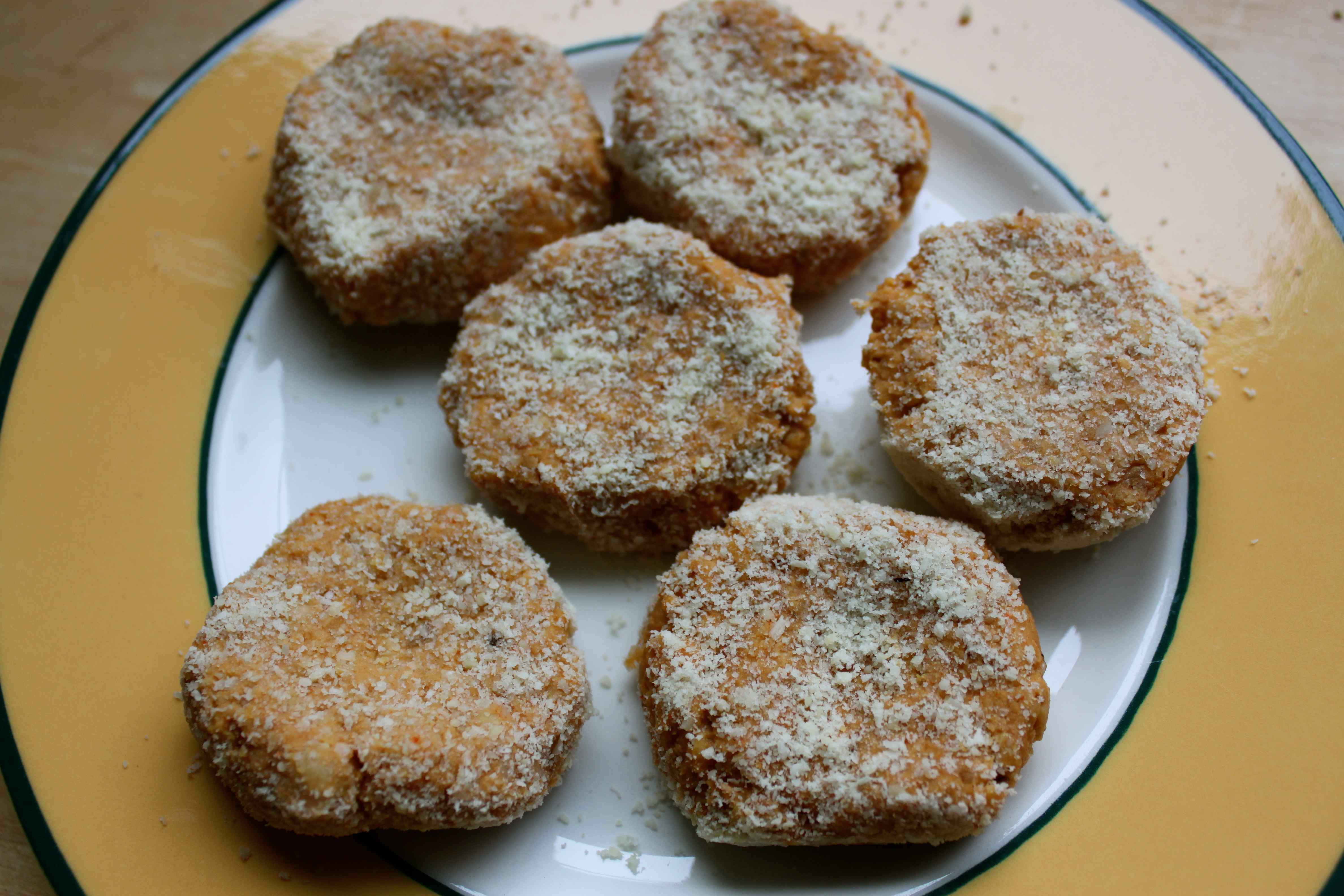Dredge each patty with ground almonds and flatten gently.
