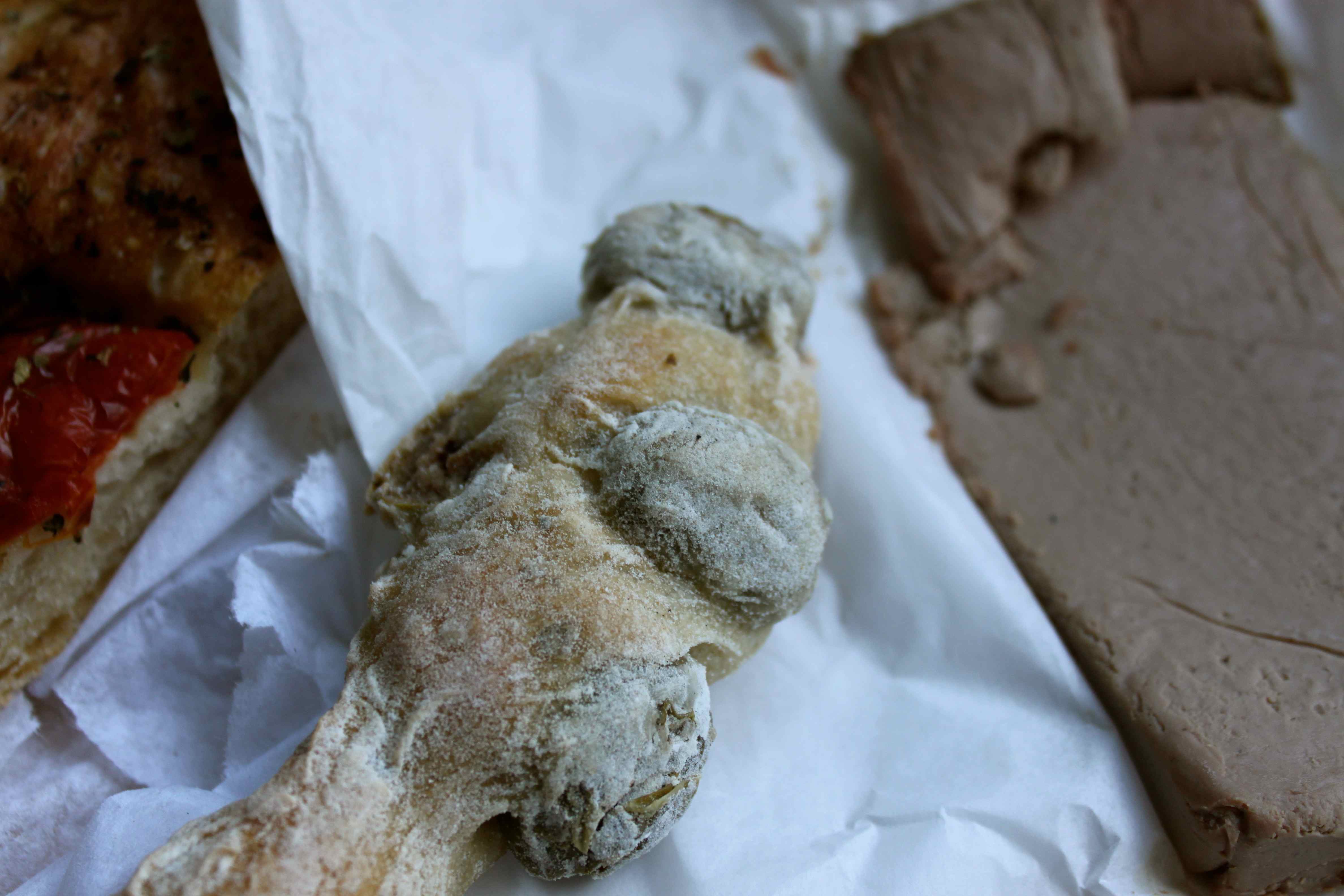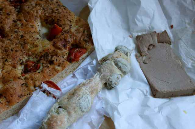 Big fat full of flavour green olives in a stick of chewy ciabbatta.  I ate it with some foccaccia and duck mousse pate.  Some foods are worth falling off the wagon for and these were definitely worth the tumble.