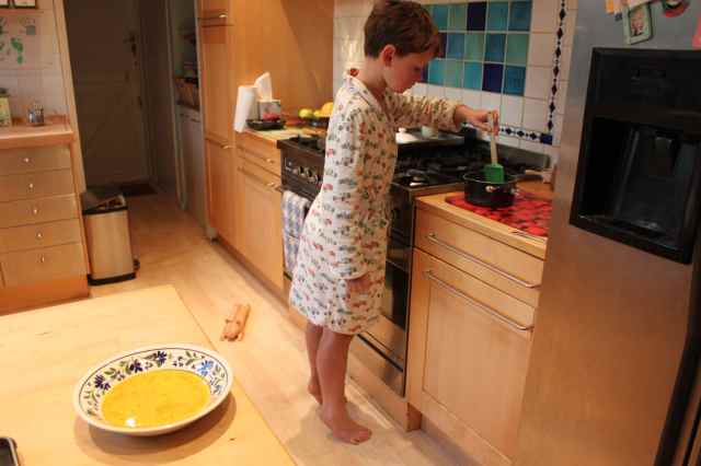 I was very happy to walk in to the kitchen this morning and see the little fella busy making himself some scrambled eggs.  I am so happy that he is now confident enough to cook a simple breakfast on his own, and does not need my help at all.  Even if it means there are no eggs left for me!