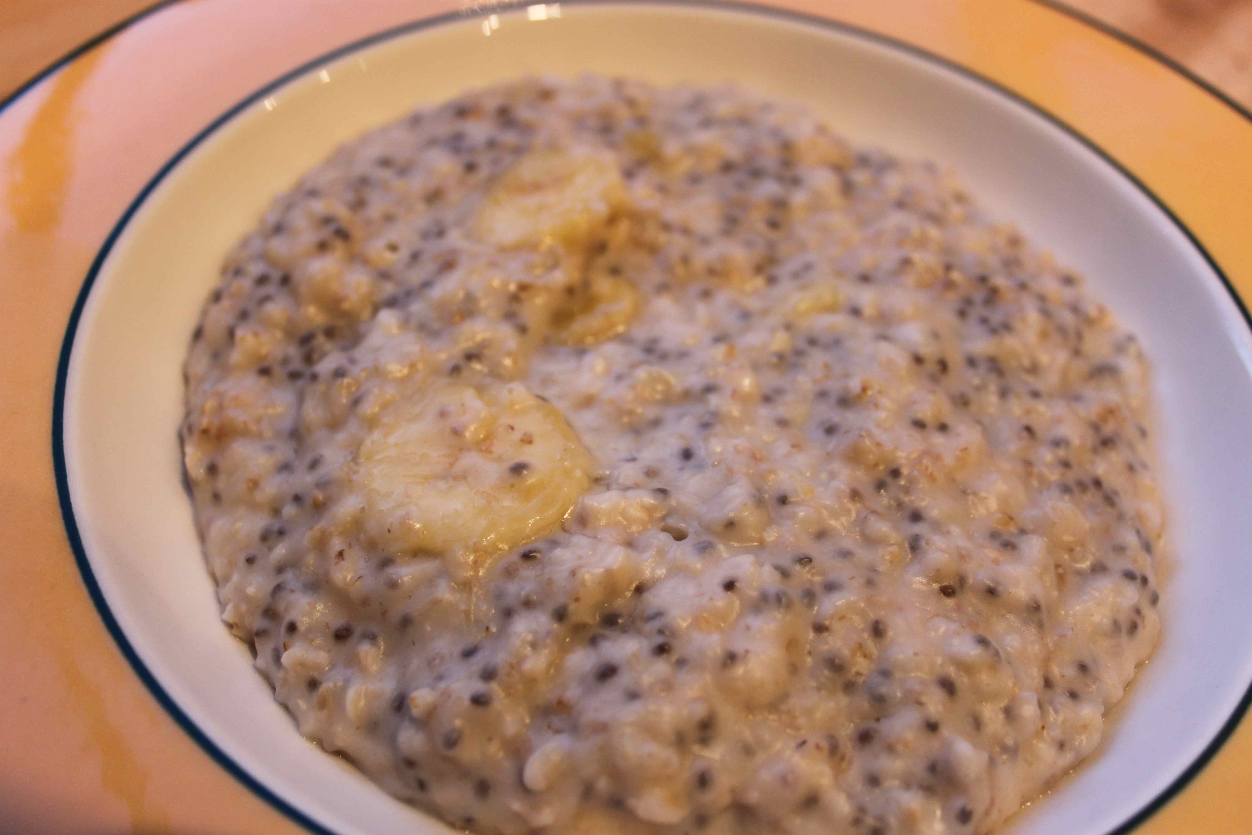I made myself porridge for breakfast: 30 g oats, 1 tbsp chia seeds, 100 ml coconut milk, 50 ml water and 1 banana.